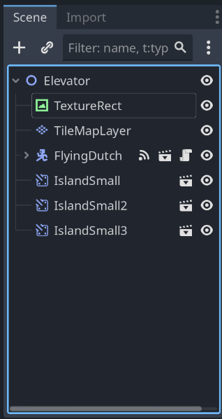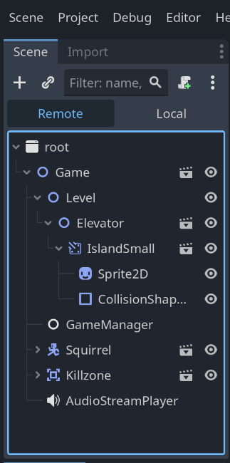 Strange. In Remote I can see only Elevator(root) and one island were added. TextureRect, TileMapLayer, FlyingDutchman, IslandSmall2. IslandSmall3 were not added. In fact, I can’t see this island on the screen. Only squirrel and gray screen