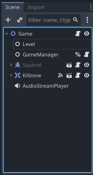 But it does not work. After starting game and clicking the button in menu game scene loads with gray screen, music and squirrel sprite. Here are game’s nodes