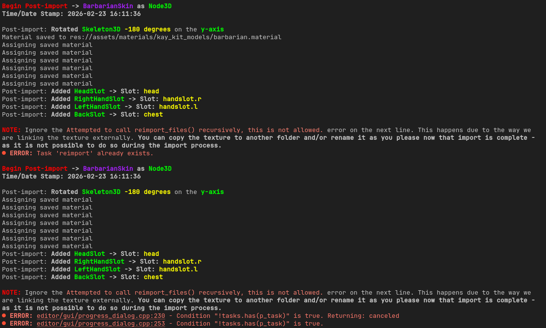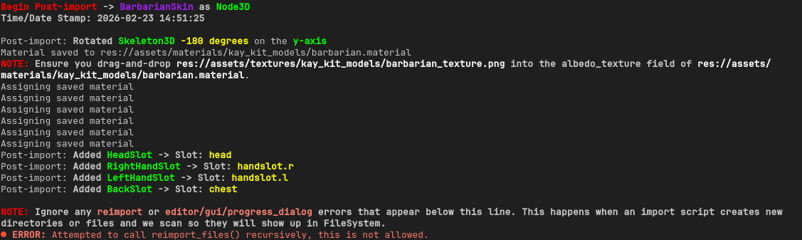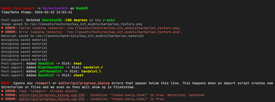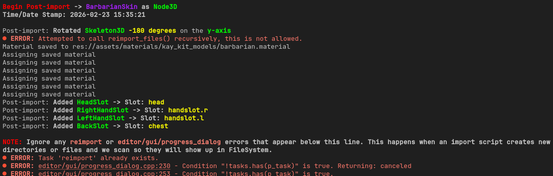 print_rich("\n[b][color=red]NOTE:[/color] Ignore any [color=salmon]reimport[/color] or [color=salmon]editor/gui/progress_dialog[/color] errors that appear below this line. This happens when an import script creates new directories or files and we scan so they will show up in FileSystem.[/b]")