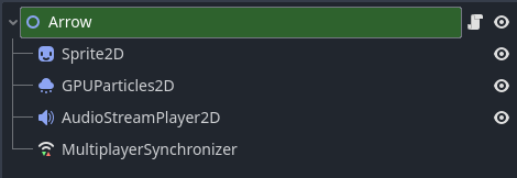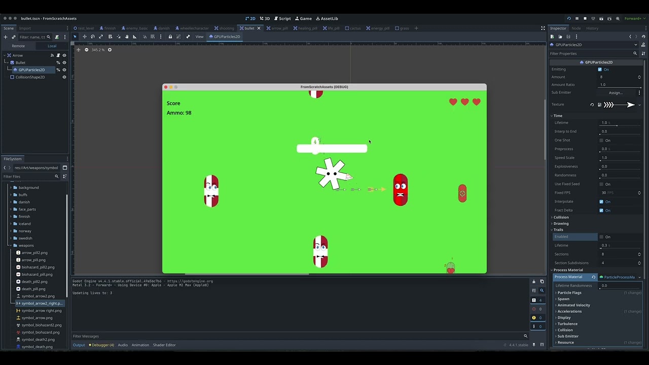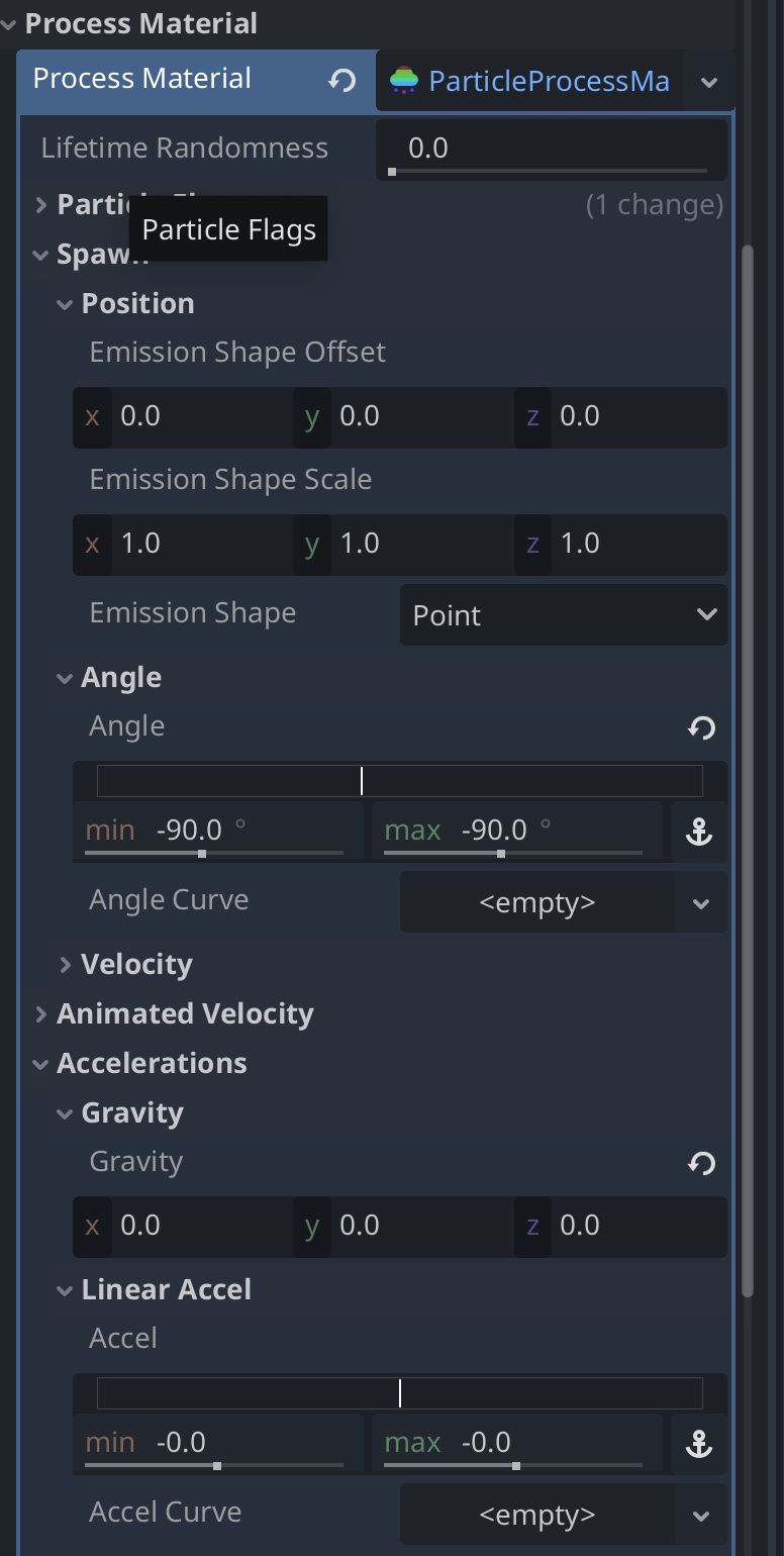 Bullet is sprite2D with Child GPUParticles2D - Sprite is rotated 90 degrees as picture pointing up instead of right , GPUParticles I have used Spawn-Angle min - 90 degree , max -90 degree to basically align with sprite but this unfortunately doesn’t adapt if its shot with different angle then right .