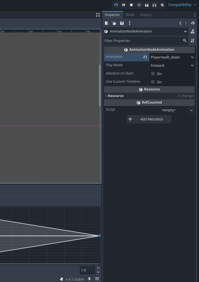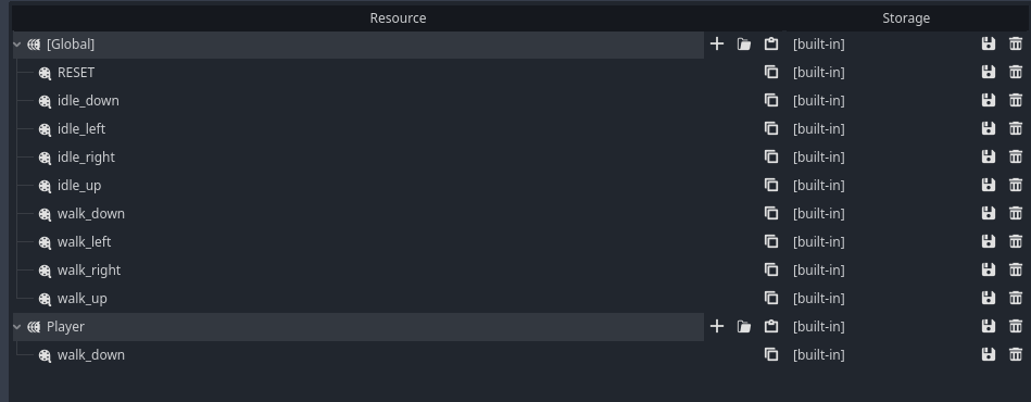 And in AnimationTree, Walk state machine, I change my global animation “walk_down” to “Player/walk_down” and every stop animating, including my walk_left, walk_up, walk_right,..