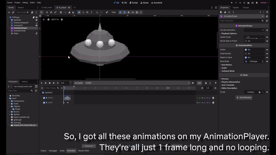 Hi! While messing around with the AnimationTree and other animation nodes, I noticed an undesired behaviour occoring in AnimationNodeSpaceBlend2D. My character has lots of directional animations which are all 1 frame long and they don't loop, but then I got curious and tried to add other effects on these animations that are inside the AnimationPlayer node connected to the AnimationTree. However, the AnimationNodeSpaceBlend2D seems to stop at the end of all animations and never replays them, kinda as if the animation cursor was "stuck". The play mode is set to "DISCRETE", but I believe this happens because it assumes the animation is gonna loop and just doesn't do anything about it. Sounds like a silly problem, but I wanna know if someone is able to help me out. Thanks.