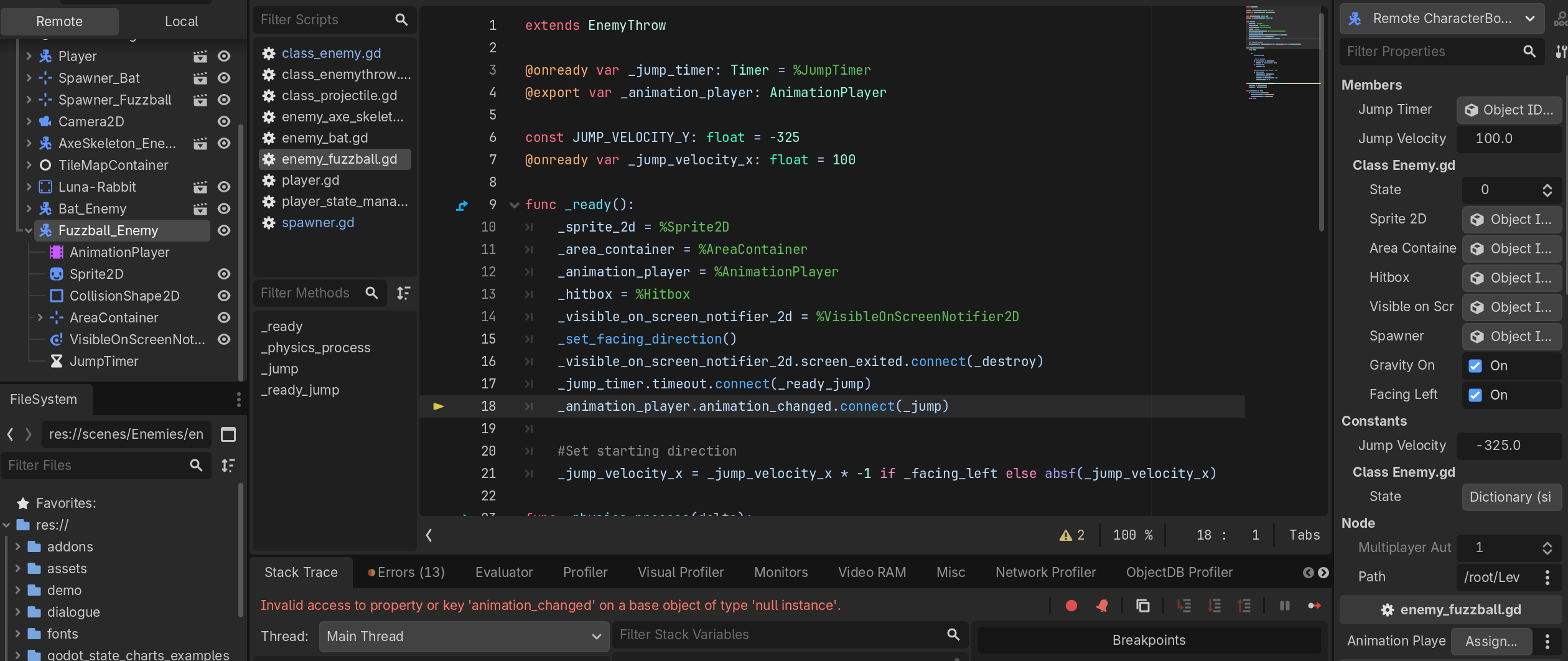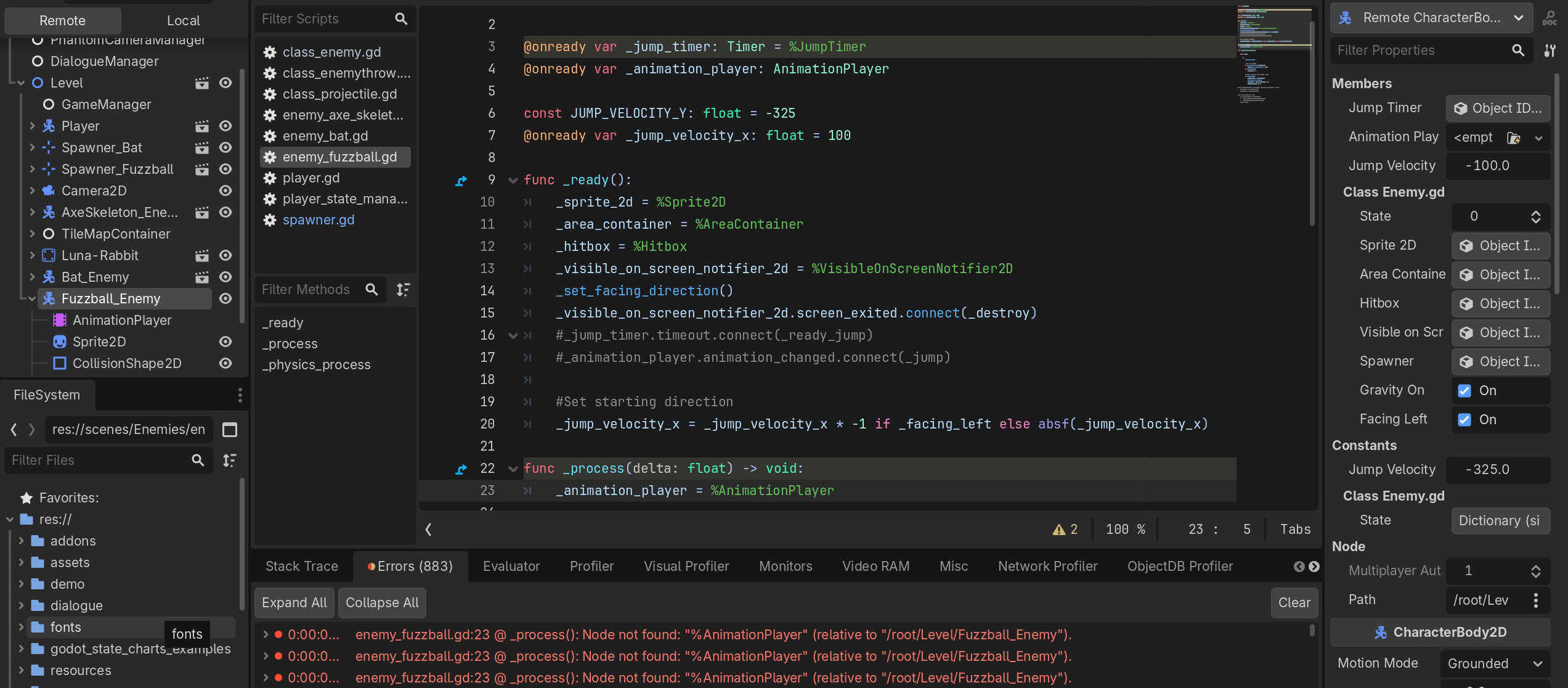 I have spawner scene with the following code that’s supposed to instantiate, relocate and then add the assigned Packed Scene to the level scene. Both the bat and the fuzzball are spawned using the same spawner.