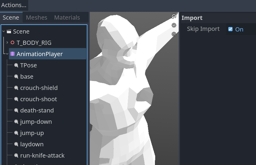 Sometimes though I need to update some of these animation .res file, however I can not do it without including animationPlayer. So when I re-import my .gltf it will create a duplicate animationPlayer and change the name of my original one (eg. @animationPlayer@12345). I then need to re-import my model without animationPlayer again, and rename my original back to animationPlayer. (as to not break my animation script)