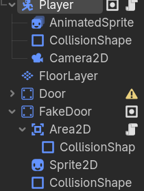 Today I noticed my hidden easter-egg (a door with a funny popup upon interaction) could be interacted with anywhere in the scene. This isn’t supposed to happen, since an Area2D I put as a child of the door (StaticBody2D) with a script attached should’ve only let the popup show if the player is inside the Area2D. I checked the sizing of the Area2D, it’s parents and siblings but everything looked normal. Then I checked the player. Also perfectly normal. I am also sure there is nothing else controlling my interaction in the scene.