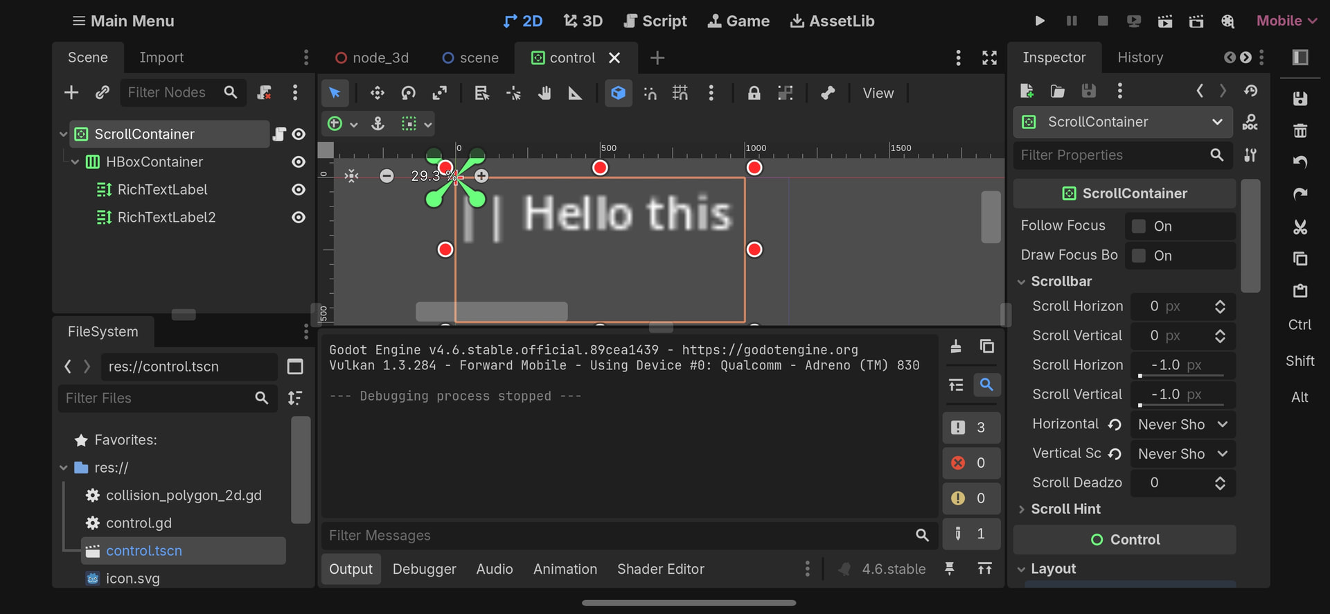 I tried checking around for any similar topics that use RichTextLabel nodes, but couldn’t really find any, only one for a regular Label node, which required it to be a child to a Control node.