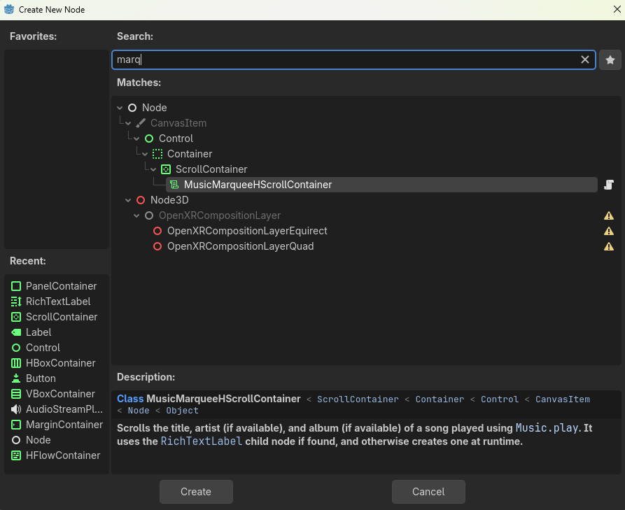 This will create a MusicMarqueeHScrollContainer node you can add to your project like any normal Node. (Minus the fancy icon.)