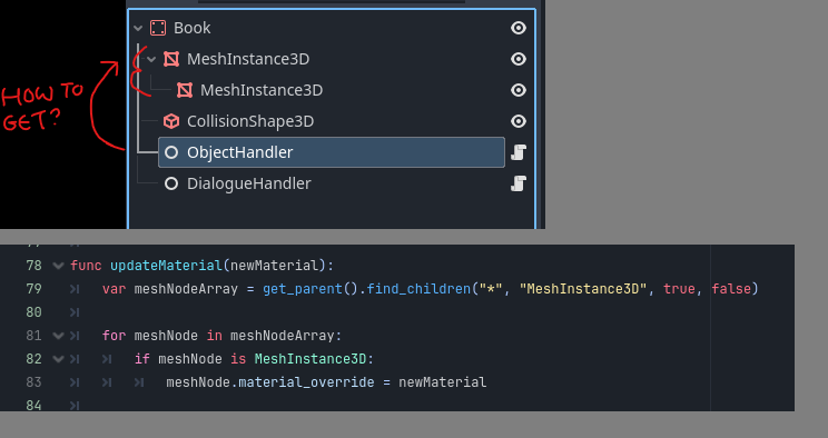 Within this scene, which is a in-world object (in this case a book), I currently have a node “ObjectHandler” which handles replacing the texture of a mesh when the object is interacted with (highlight when the crosshairs are over it, flashes red when hit, etc…)
