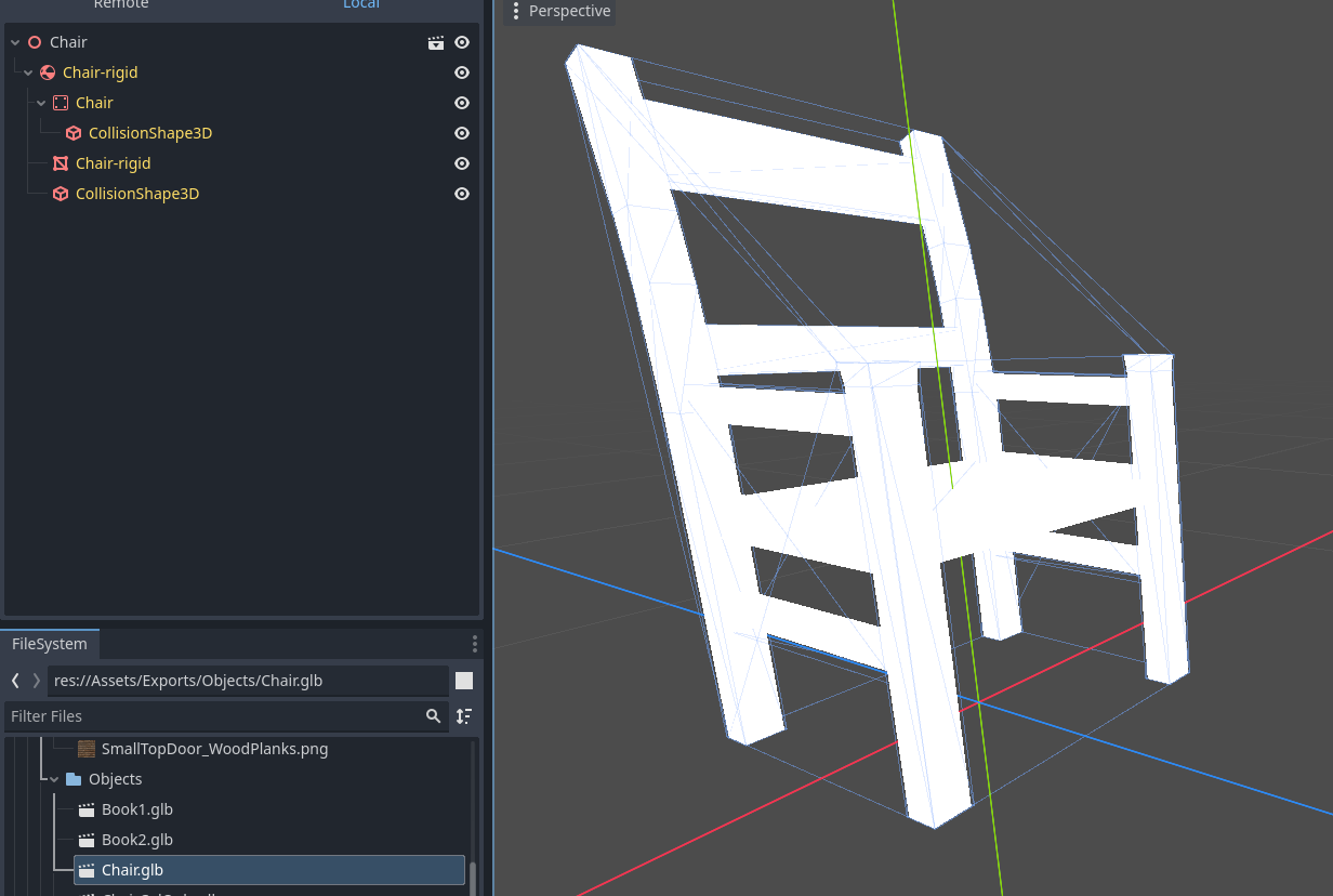 I have also tried not puttning -rigid and then putting it in a scene and making it rigidbody but then cant sent the colonly as the collison as it puts it under a static body and I want to do this without making anything local or into different scenes so I can just have one scene for the object and if I want make changes export to the same film and itll just update