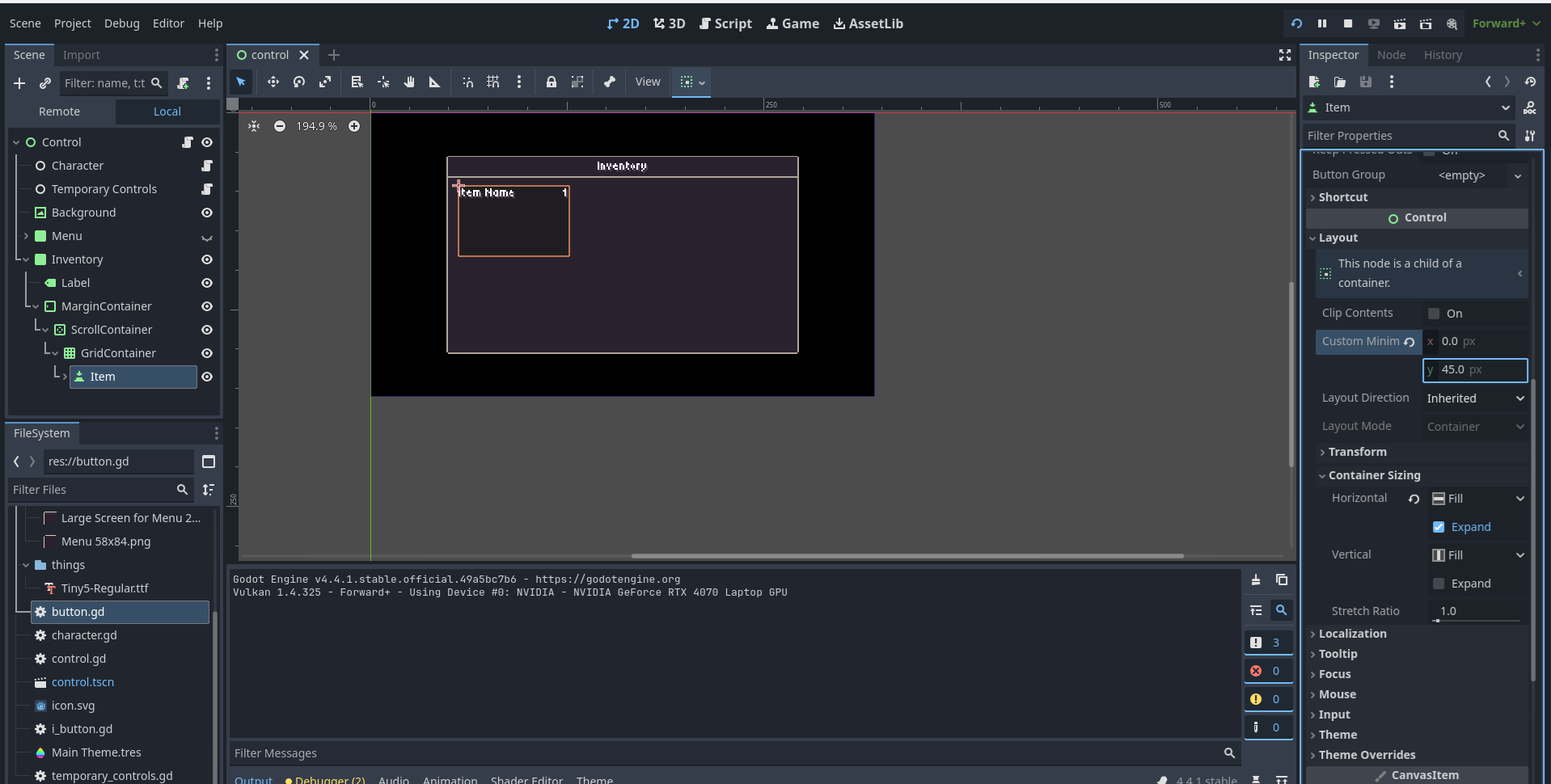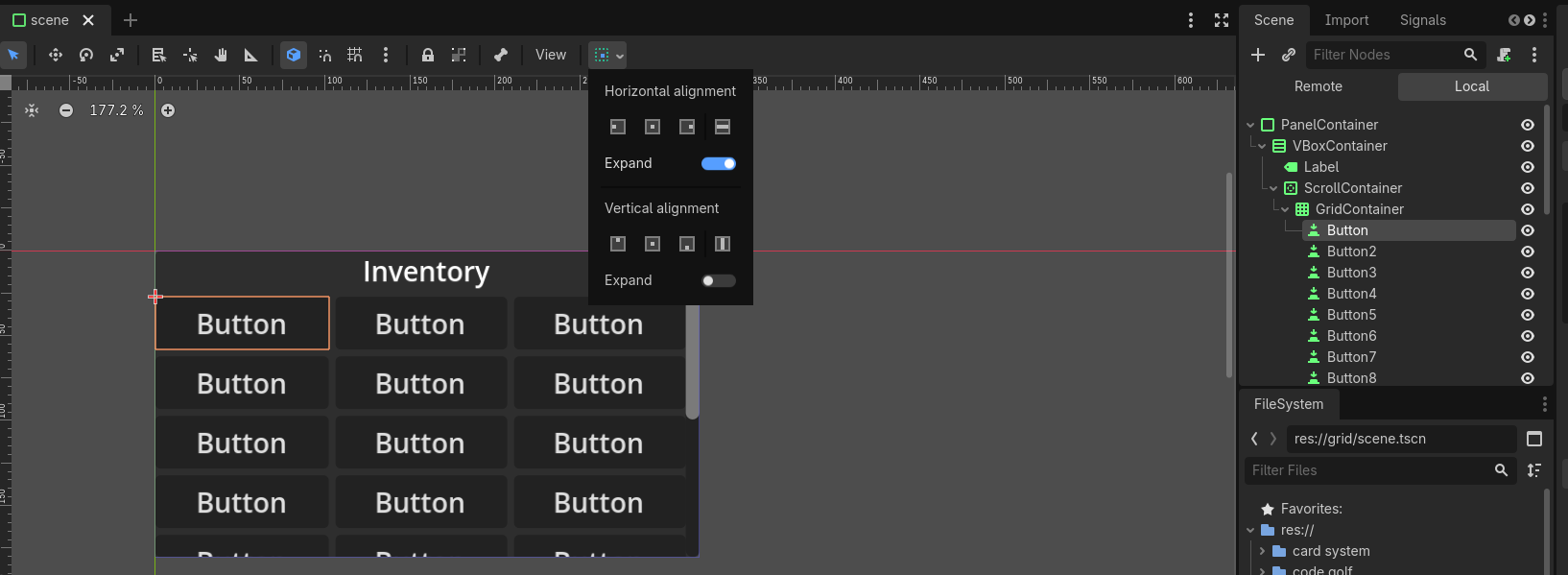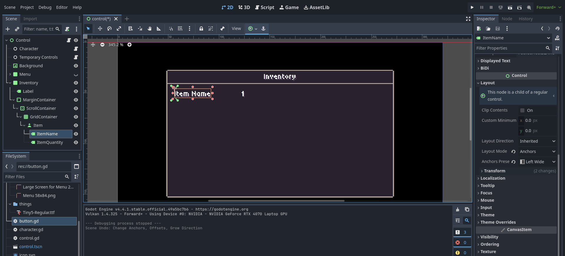 I’m making an inventory panel. My base resolution is low at 320x180. When I scale the resolution up to 1920x1080, the buttons bunch up and have some funky positioning.