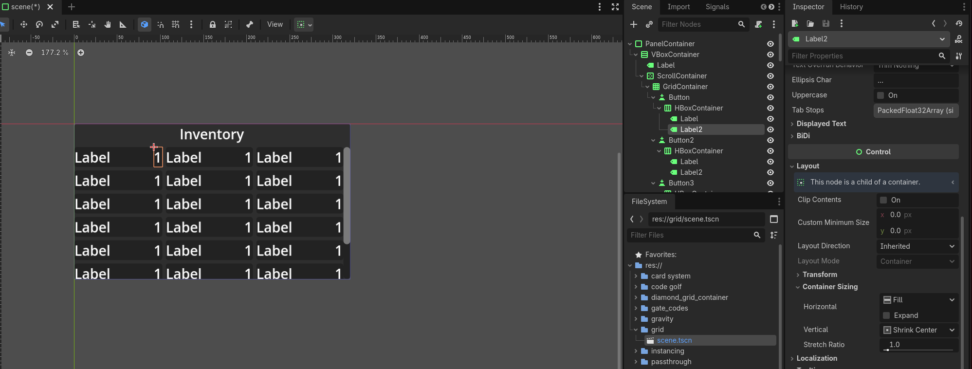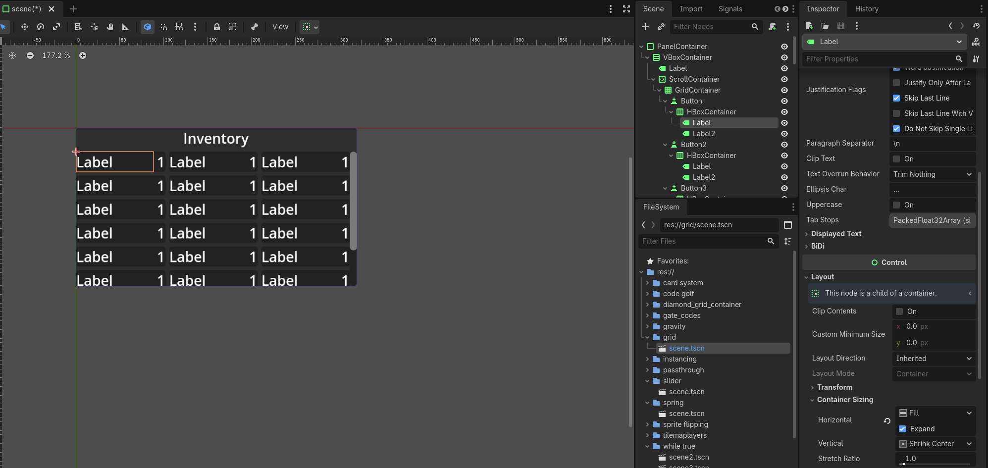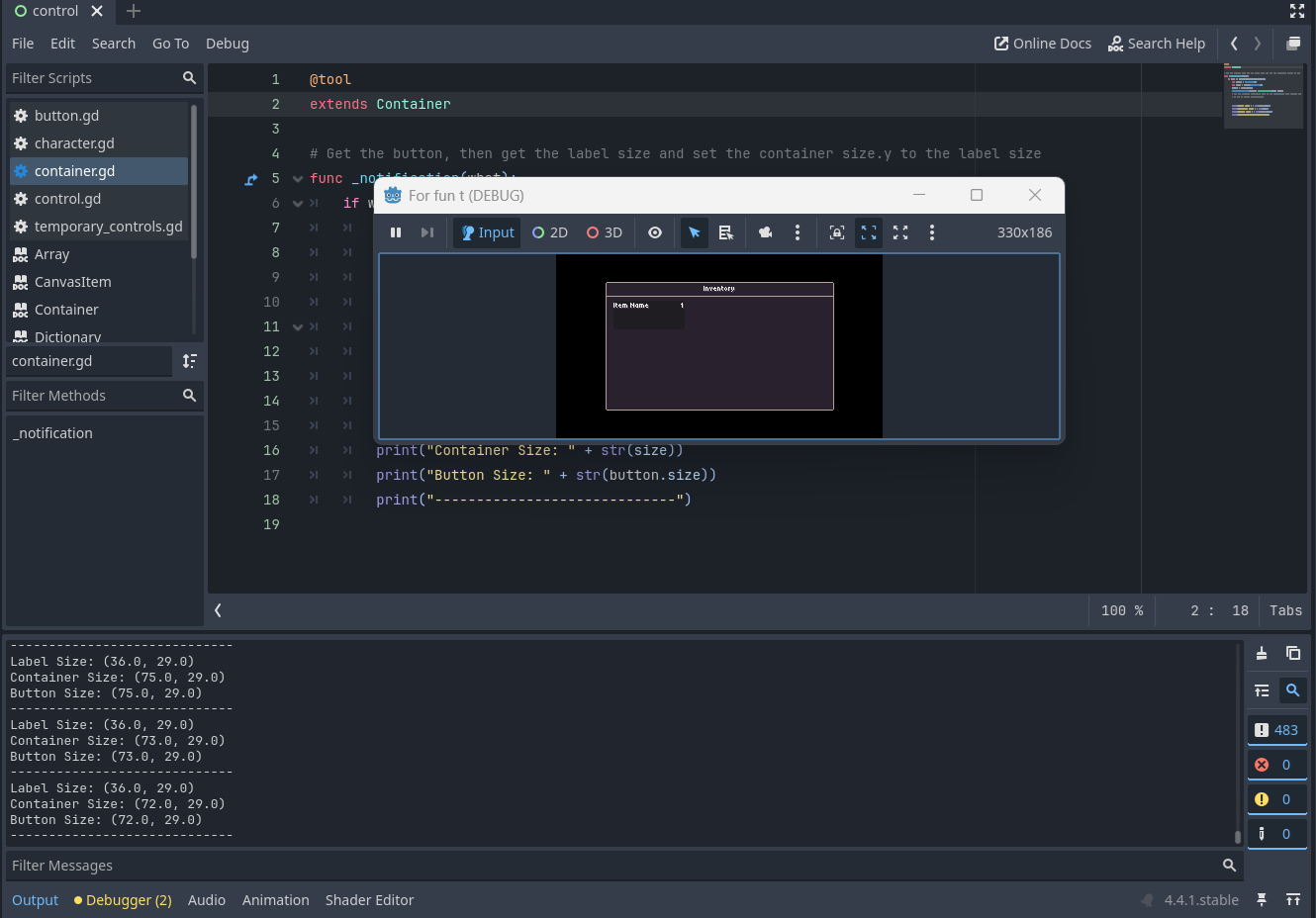 The container’s set to expand horizontally in the editor. Then I’m setting the height of the container to the height of the label. I fit the button to the container’s size. It works fine when growing the window, but I see through print statements when I shrink it back down the y-size of the label doesn’t change so the button has an inappropriate height. I’m not too sure why.