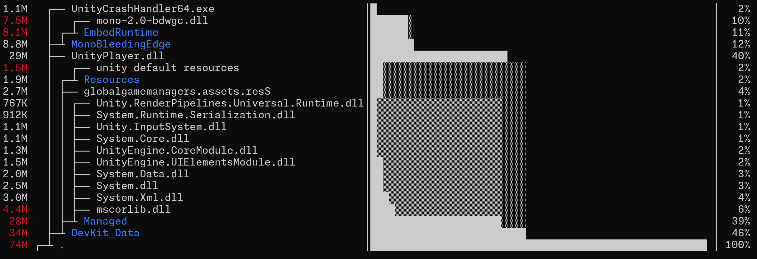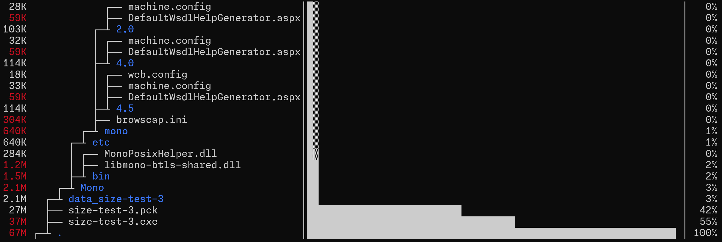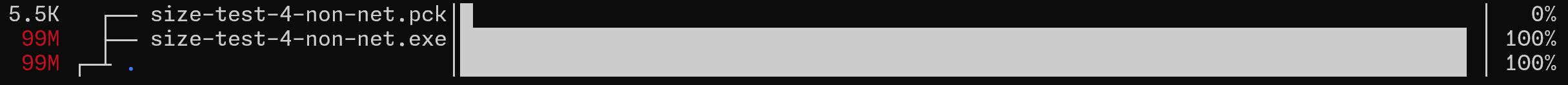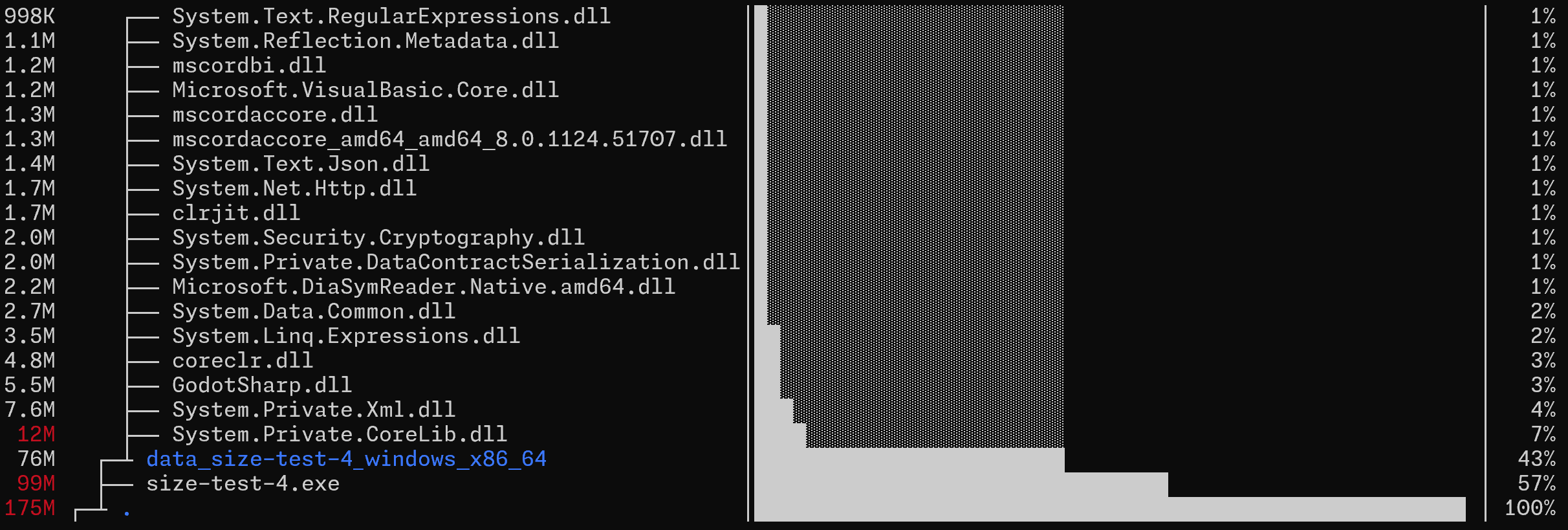 The size-test-4.exe is large though, but it can be further optimized through customizing export templetes. But the *.dll files, which are likely .NET assembly related stuffs, are taking up to ~76MB, almost half the size of the artifact, and currently I haven’t found any docs on how to deal with them.