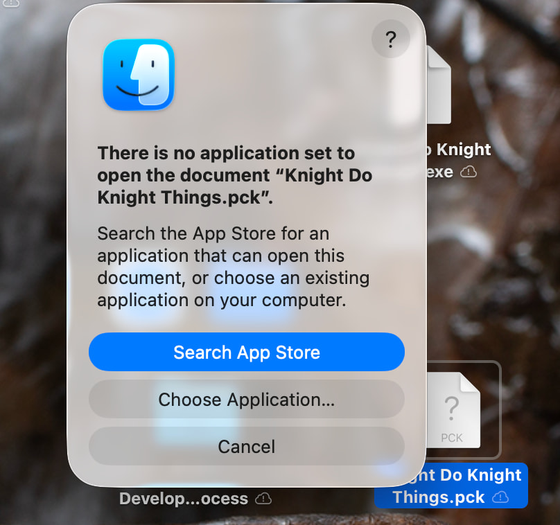 New development: when I reexported the file without the PCK toggled, I thought it would repplace the older file (it didn’t). I clicked on this one and it says there is no application to open the document.