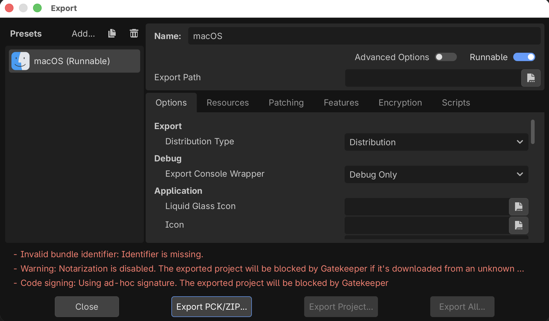 Second, as I said, you likely clicked on Export PCK/ZIP which is incorrect.