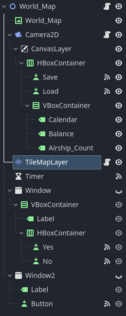 I did some re-designing of my current game, in order to simplify things. Made some progress, but I hit another roadblock. I don’t see the button move on the world map, despite having code lines making a tween. Additionally, the “if” statement under the _on_timer_timeout()" method doesn’t seem to trigger. I do sometimes see the cargo amount be subtracted in the output, but not always. I suppose it is possible I am not seeing the button moving on screen because of the possibility the “create_airship_icon” is not being triggered because of this. I have the “World_Map” image in z-index 0, with the “TileMapLayer” z-index as 1. Below is a screenshot of my node tree, as well as my code, any feedback that would help solve this would be greatly appreciated: