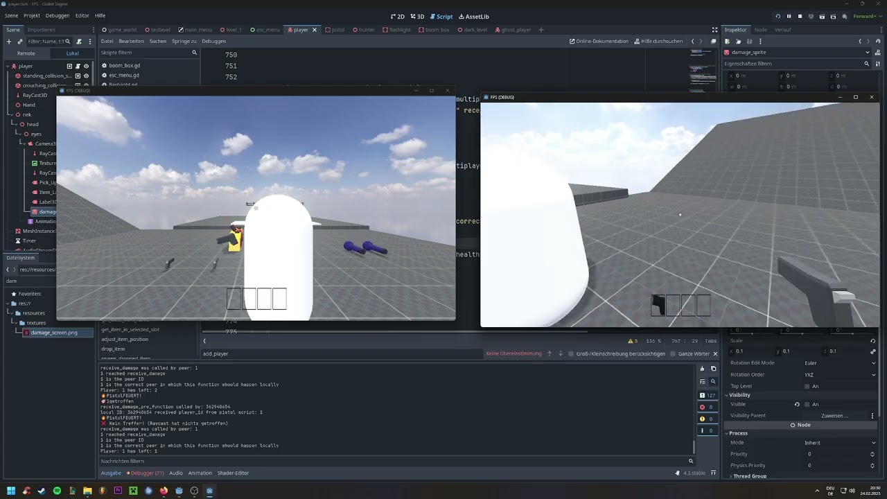 when a client presses _damage_sprite(), it shows the damage sprite to all players at least from the clients perspective, from the other’s perspective its not there. so I think slowly i get the hang of the problem. Its kinda like a client tries to change a node from the other clients/hosts but isnt allowed to. So basically everyone is using the same player scene, and if you change a node at least locally it is synchronized to the others but only visible to the one changing it. Ive managed to solve this one by adding the visibility to the multiplayersynchronizer. but im still unable to do it in the rtp function