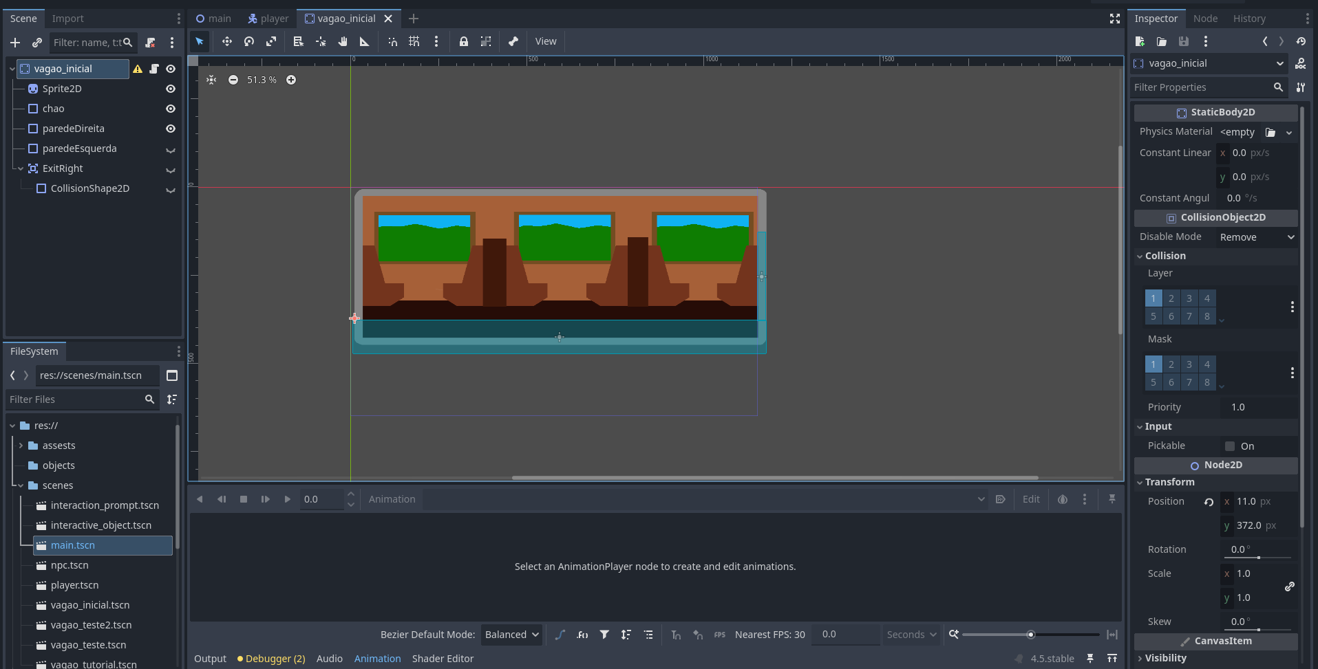 I would guess you’re hitting the “paredeEsquerda” collision shape? Its visibilty is turned off, so you can’t see it, but that doesn’t disable the collision.