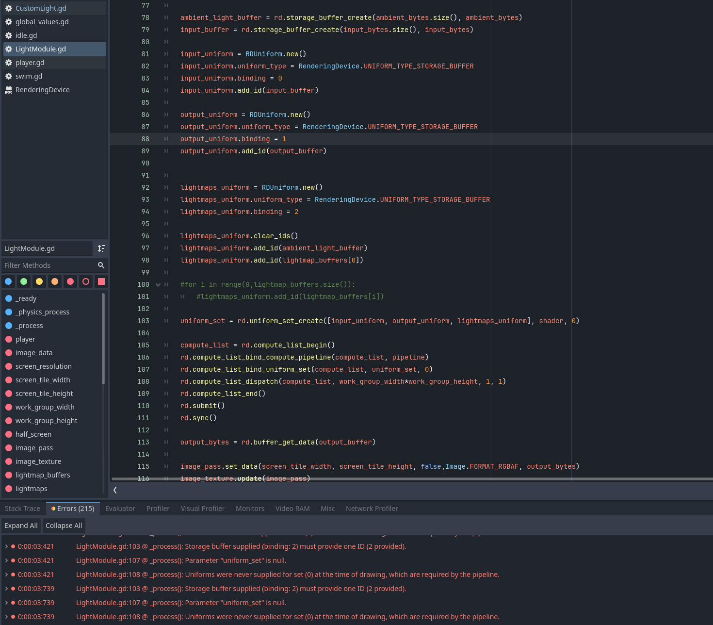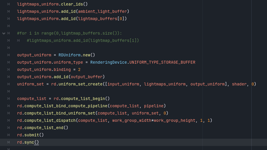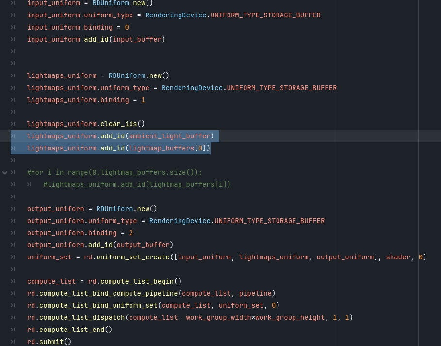 The context is i have nodes calculating lightmaps, and i’m trying to bind the outputs buffer directly to the shader that will mix them. Below are the relevant script part and .glsl