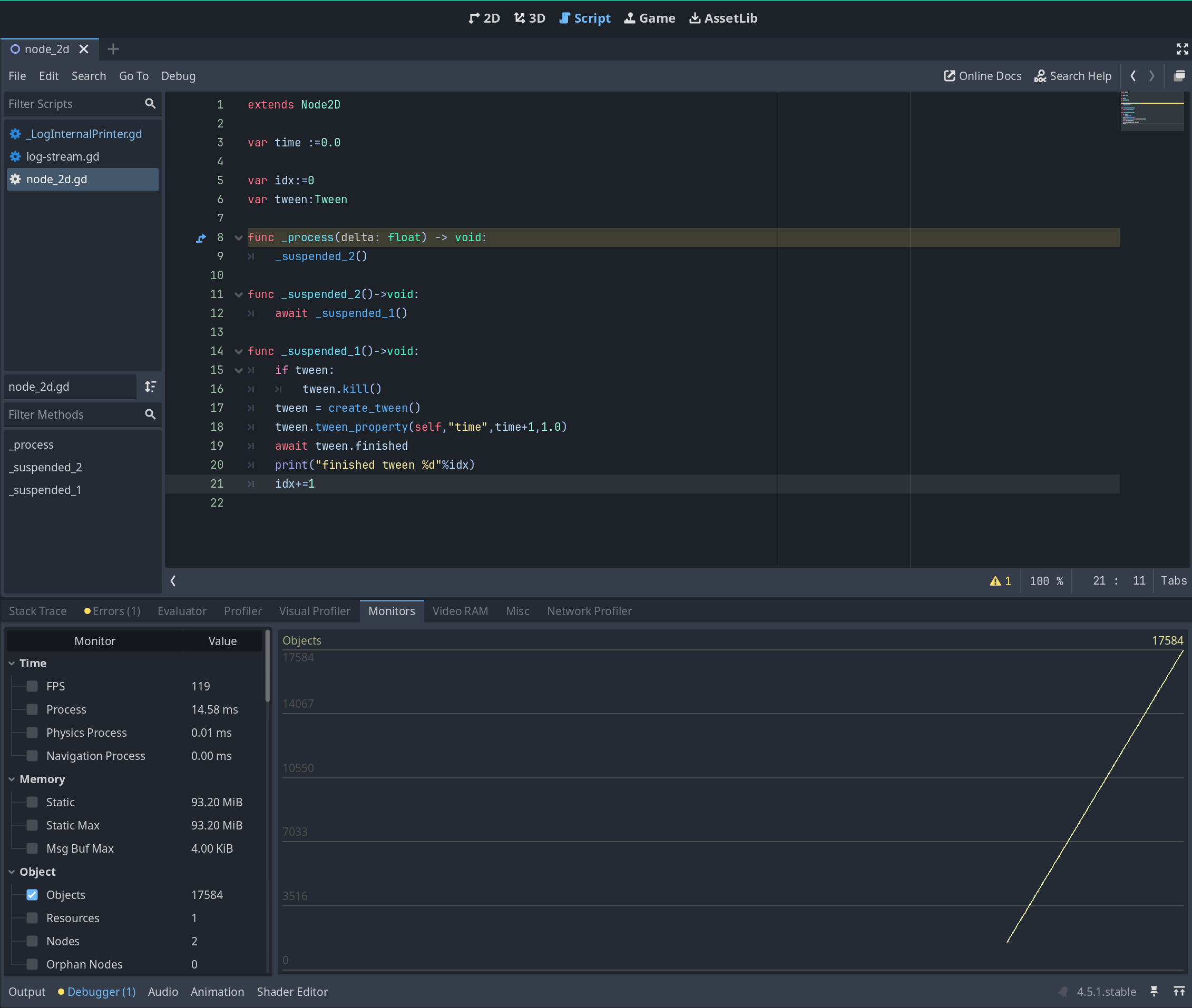 Could you avoid creating coroutines and tween in _process? That can cause many issues on it’s own.