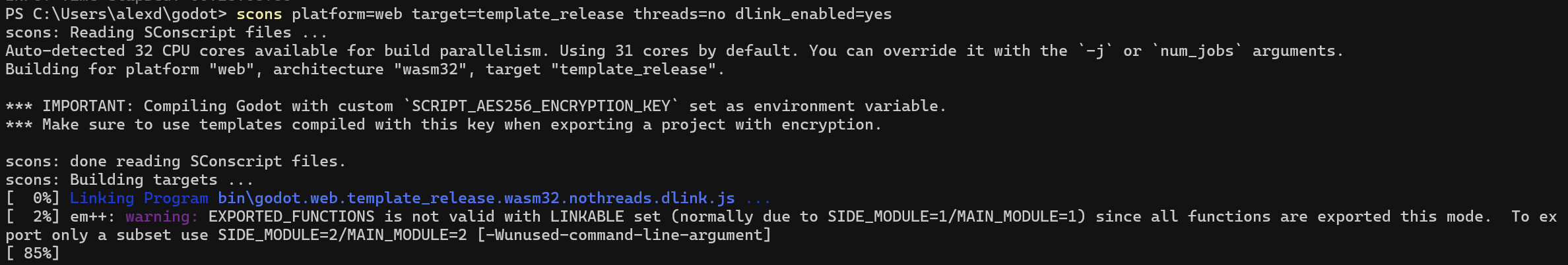 Heya, as title says, when trying to compile a custom export template for my game it’s getting stuck on 85%. I don’t have this issue while compiling custom linux or windows templates, any help?