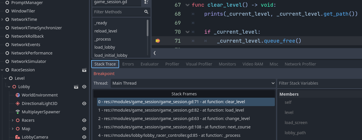 My game has a custom level switcher for online multiplayer since it has to stay on the same scene. It stores the node of the current level in a variable called _current_level. When the level is cleared, it gets deleted with this line. This works totally fine in Godot 4.4. After I updated to Godot 4.5.1 the queue_free() call always crashes the game without error. This happens in both singleplayer and multiplayer modes so it’s not a specifically multiplayer bug. Is this a problem in Godot 4.5+? The only thing that works for me is downgrading engine version.