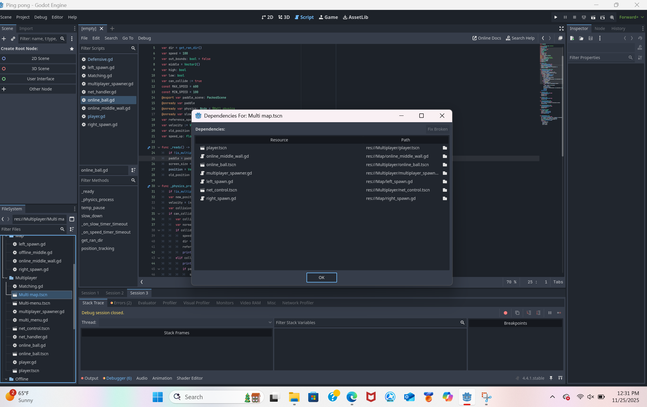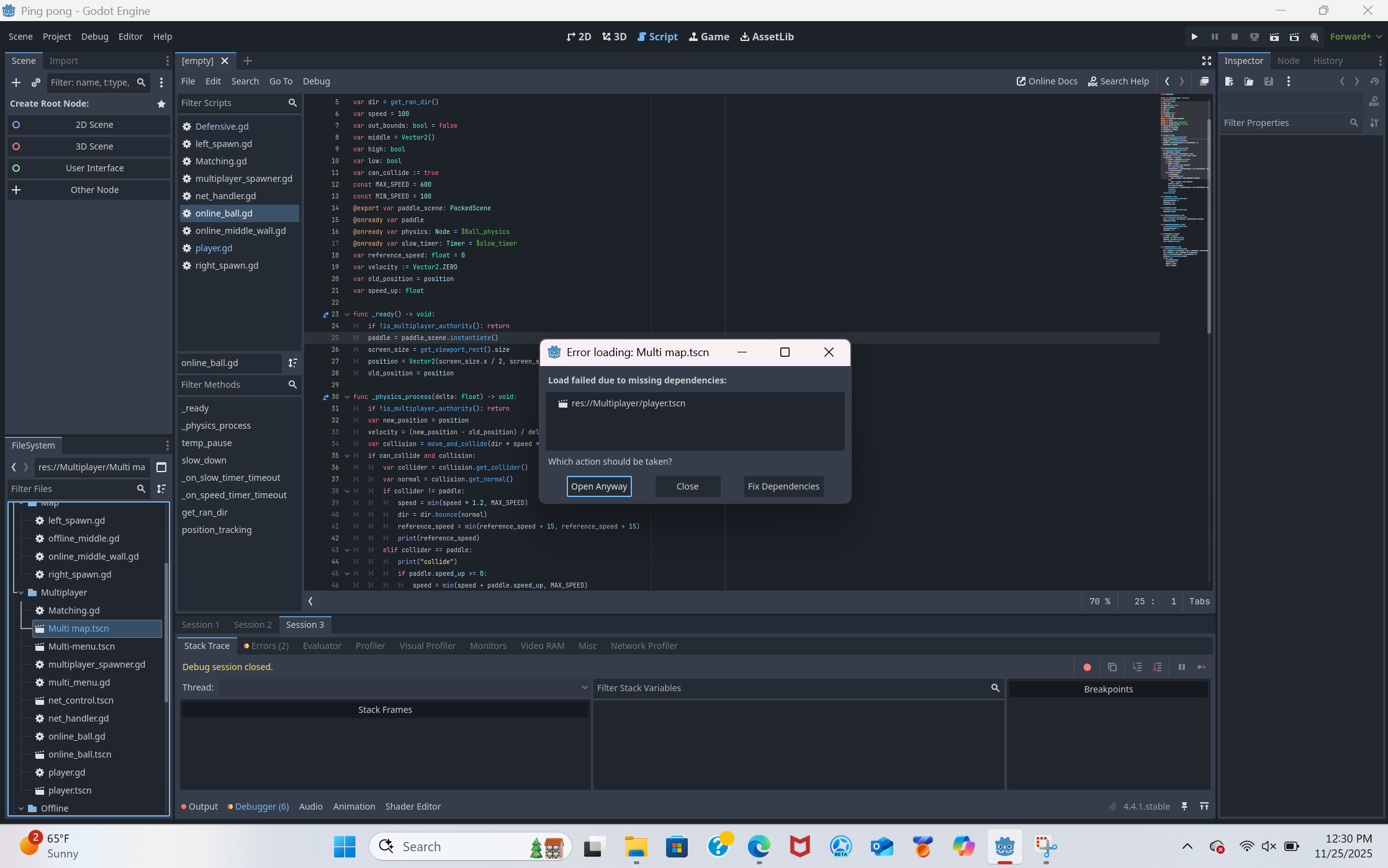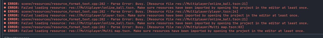 My ball node is already in the multi-map from the start but player has to be spawned in from code in the multiplayer_spawner node, which is why I used packedscenes. Net_handler scene still opens despite being mentioned in the dependency list and it does’t reference either. All of this worked perfectly fine yesterday. Removing the references still doesnt fix the issue. It probably is a circular dependency issue but ive never dealt with a problem like this before.
