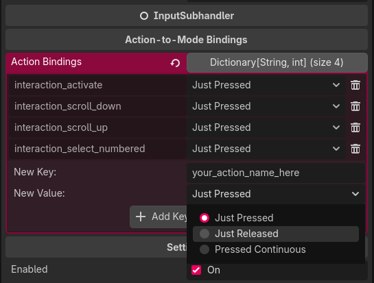 I use an exported property to tell the InputHandler which actions activate the individual subhandler.