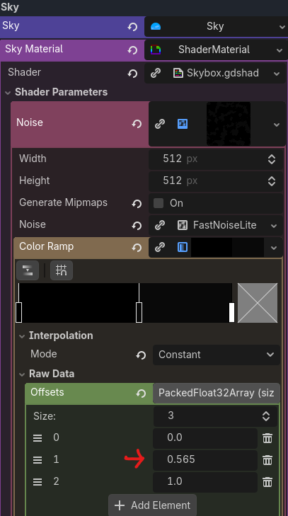 I currently have a 3d project and I’m trying to create a skybox using WorldEnvironment. I want to change a shader parameter of an offset in a Gradient color ramp a noisetexture2D.