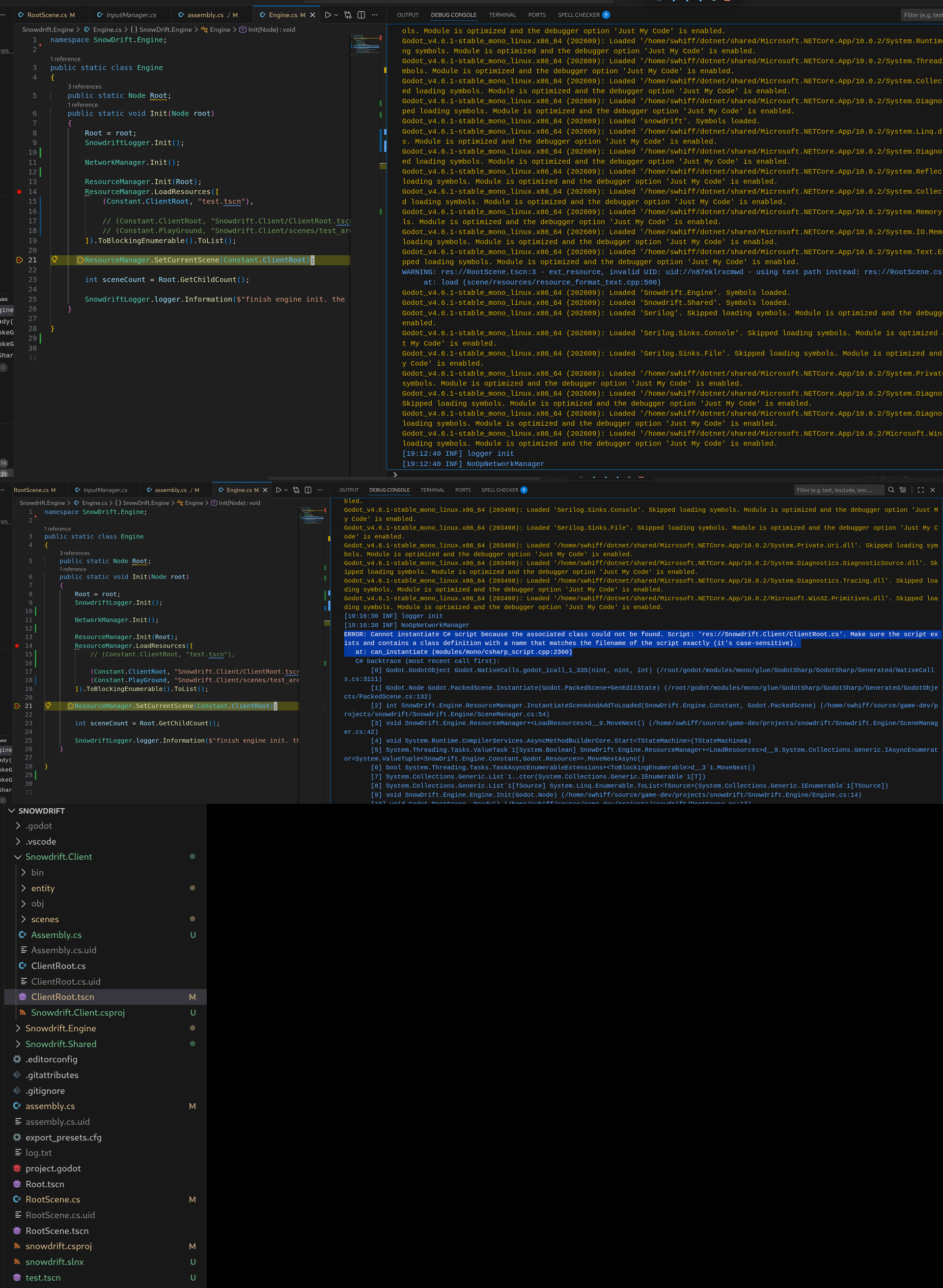 ERROR: Cannot instantiate C# script because the associated class could not be found. Script: 'res://Snowdrift.Client/ClientRoot.cs'. Make sure the script exists and contains a class definition with a name that matches the filename of the script exactly (it's case-sensitive).
