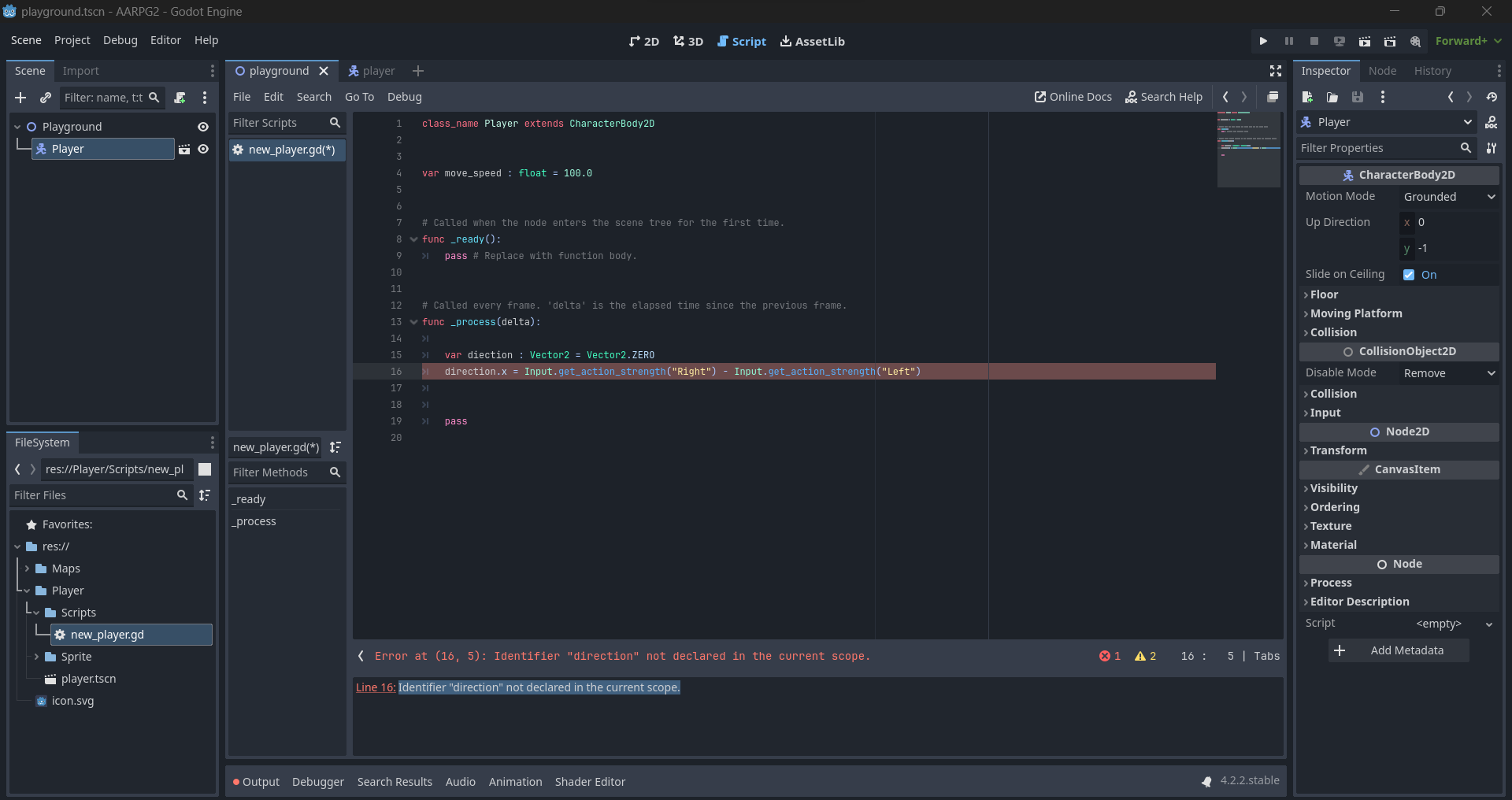 Hello everyone I am following a playlist on youtube to learn how to make a classic rpg. Going through the video I came to an obstacle, I got the error “Identifier “direction” not declared in the current scope.”