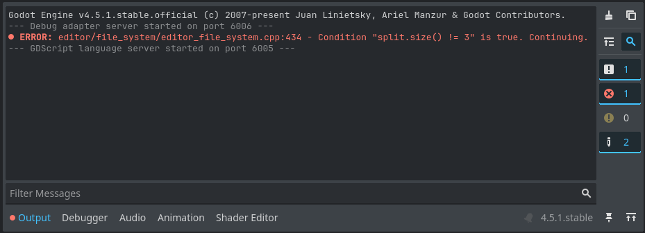 It seems there’s some issue in one of the project’s cache files (“res://.godot/editor/filesystem_cache10”). Try to delete that file (or the whole cache folder).
