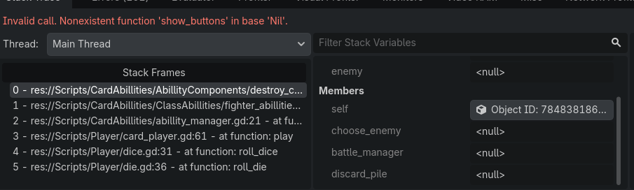 What is happening: ChooseEnemy, DiscardPile and BattleManager remain null after add_child() so when destroy_multiple_cards() is called I get an error saying that I cannot call choose_enemy.show_buttons() on ‘Nil’.