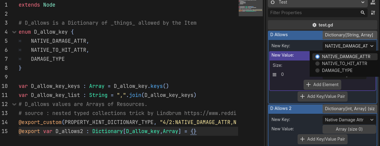 @export_custom(PROPERTY_HINT_DICTIONARY_TYPE, “4/2:NATIVE_DAMAGE_ATTR,NATIVE_TO_HIT_ATTR,DAMAGE_TYPE;28:24/17:Resource”) var D_allows : Dictionary[D_allow_key,Array] = {}