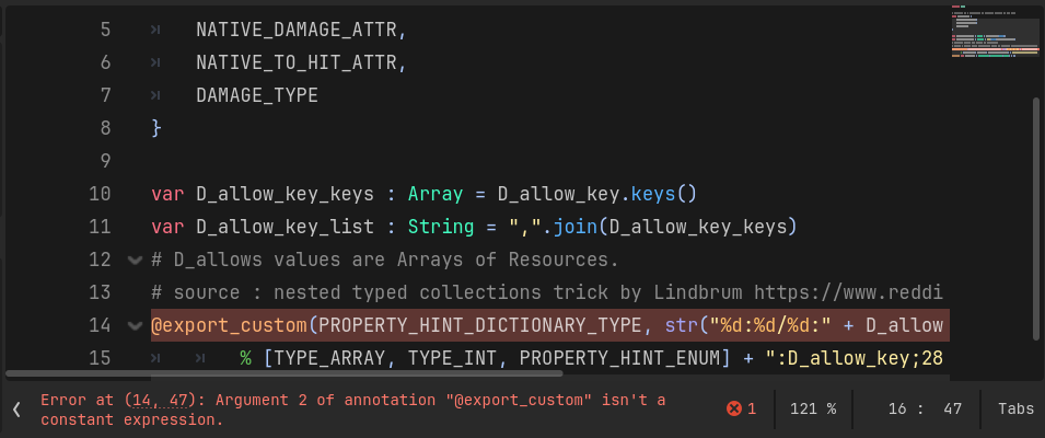 Everything seems to be in place, except the hint_string of @export_custom won’t accept variables, even if they evaluate to Strings, and it cannot defer the hint to the typed definition placed after the variable declaration (where Dictionary[D_allow_key,Array] = {} actually hints to the D_allow_key enum members).