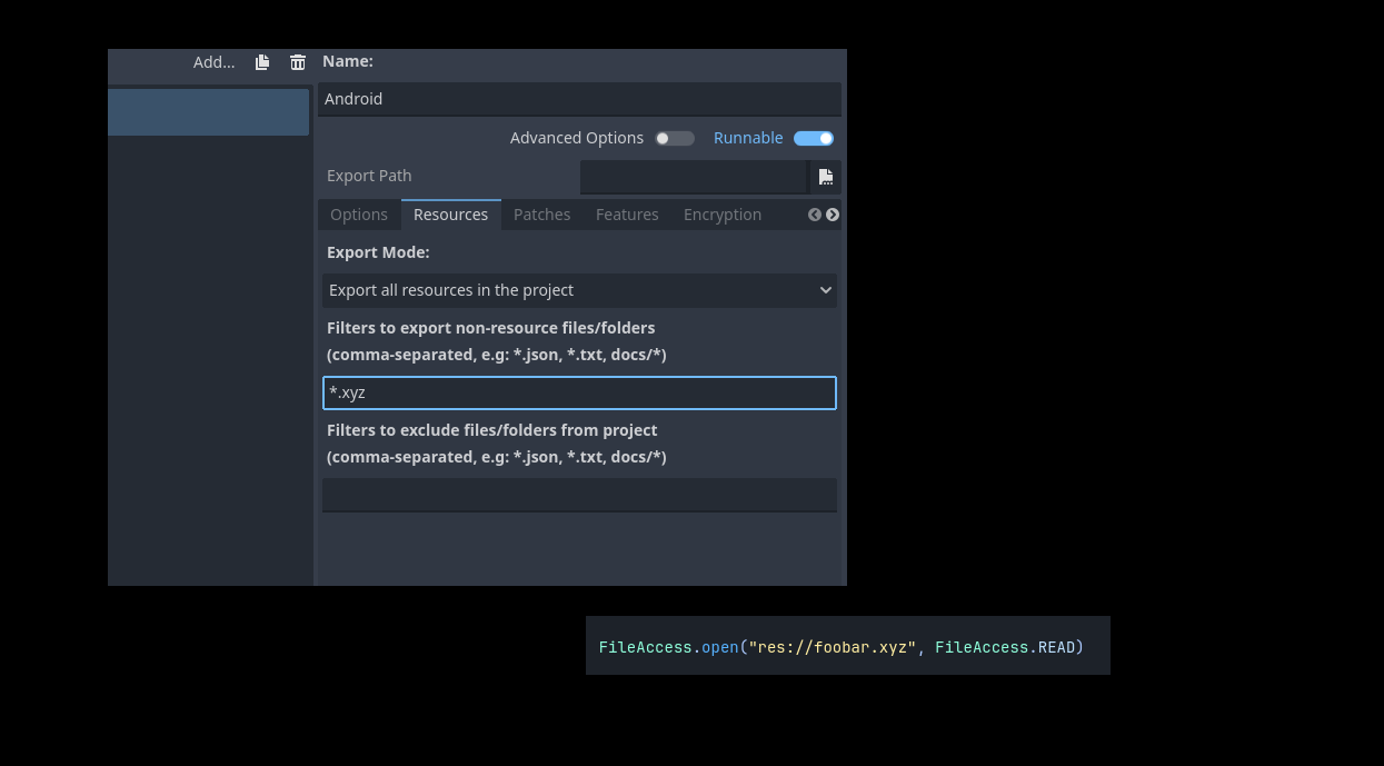 I’m trying to export my project which includes a database file. I tried to go into the resources tab in the export window and include it under the “Filters to export non-resource files” list. However, it is still not including the file during export.