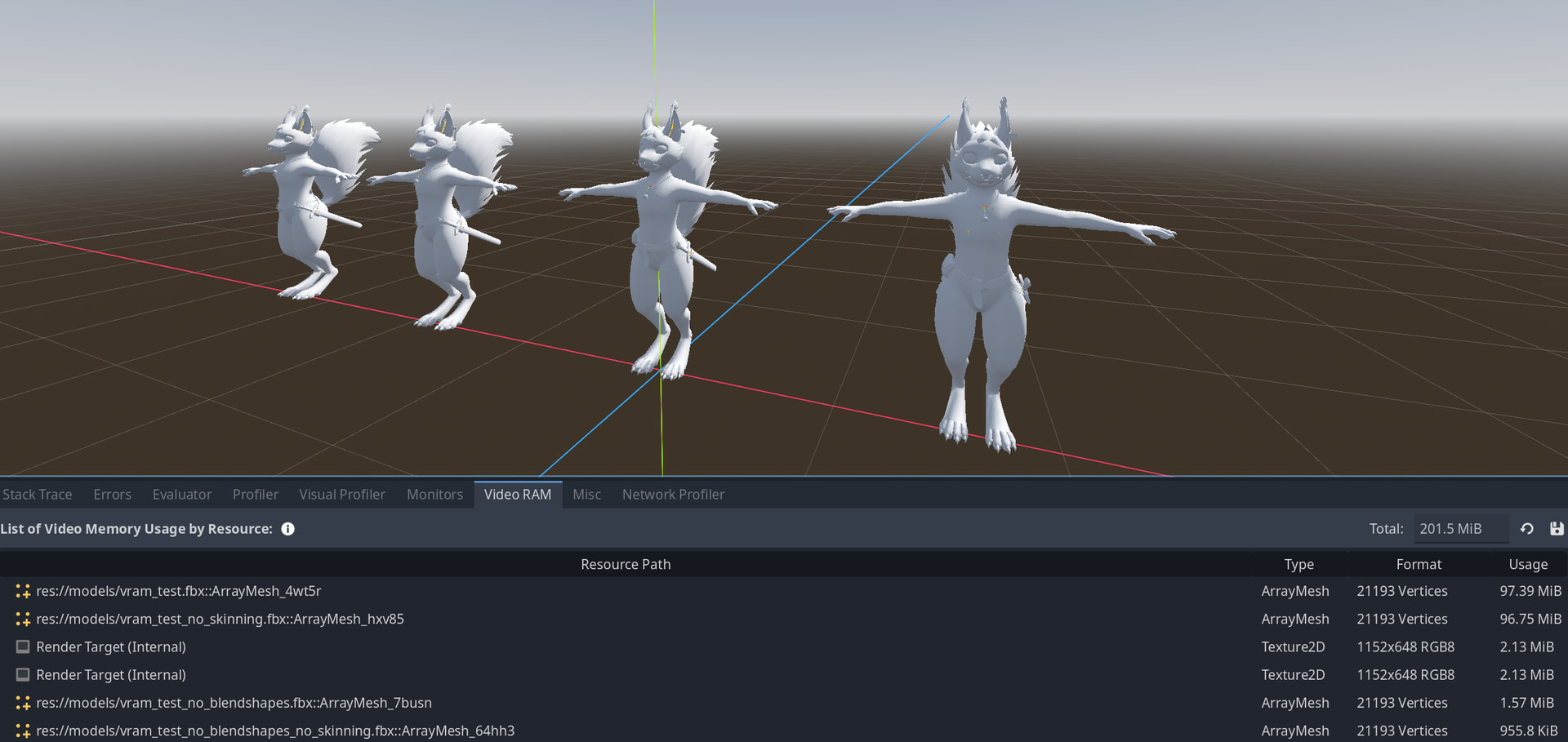 If it’s not me having configured something wrong, this would make Godot not yet well suited for 3d games with medium or higher fidelity character models.