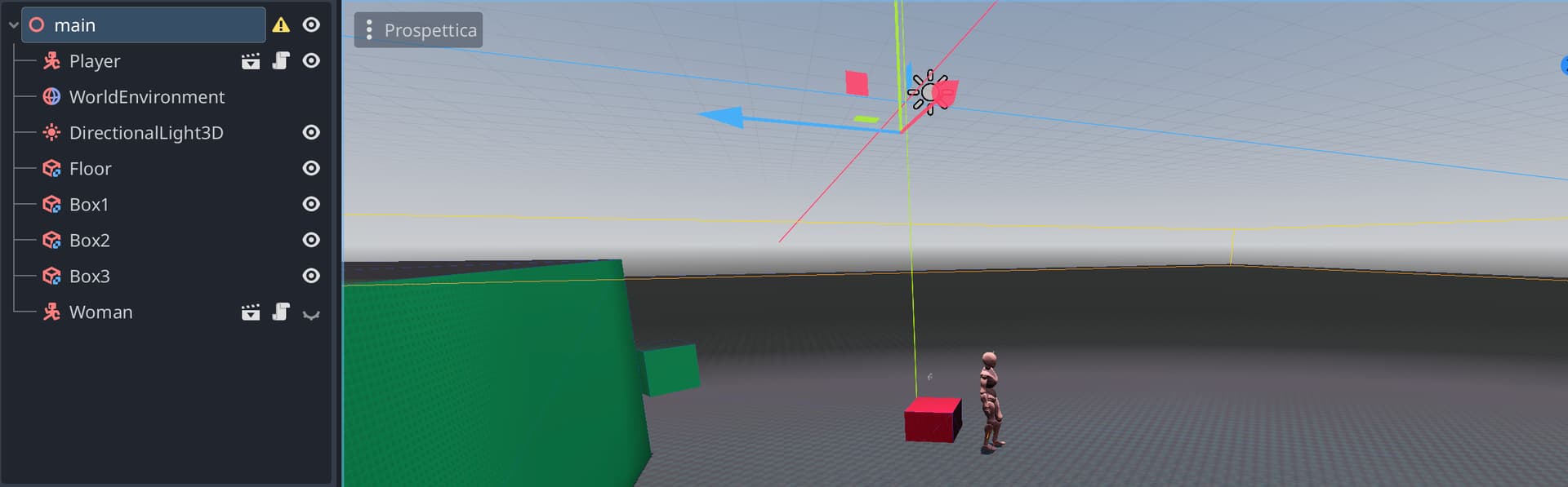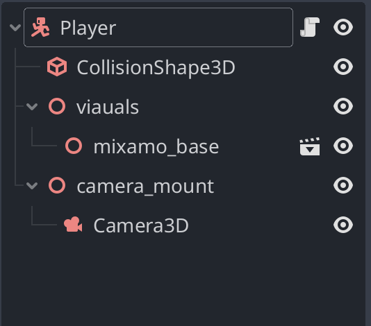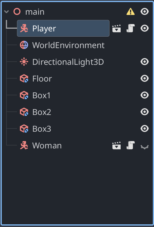 I have as root node of the scene a Node3D and one of its children is scene which is CharacterBody3D type: the Player: