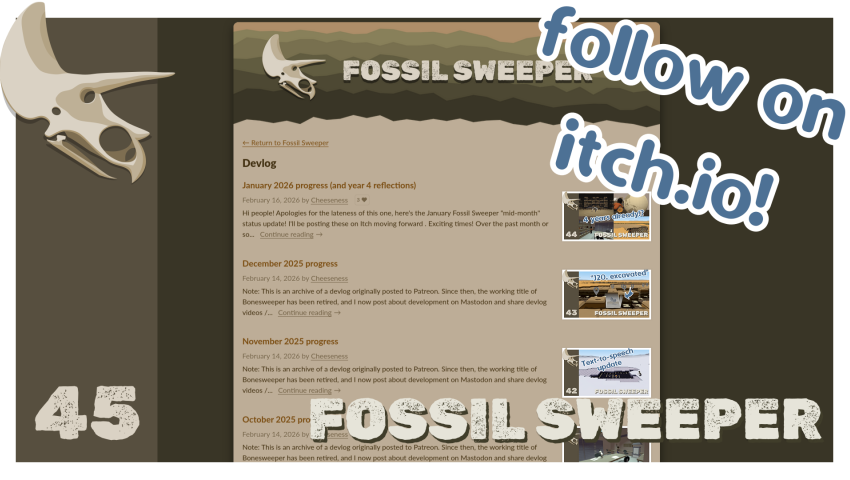 Once again, very late with this month’s update. I’ve been moving all of Fossil Sweeper’s devlog posts over to the game’s new Itch page, and wanted to have all that done so that they could all be in chronological order with the January update post last/most recent.