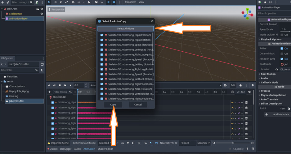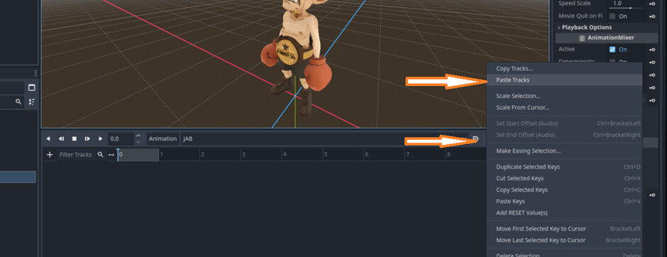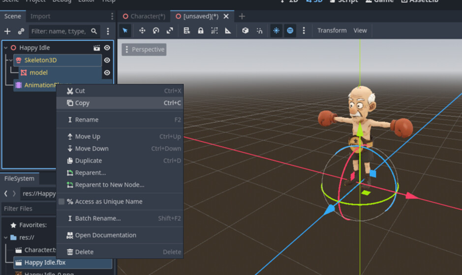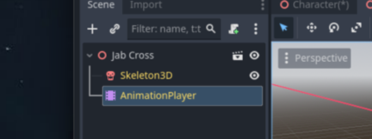 Paste the copied Skeleton, Model, and AnimationPlayer into your character scene.