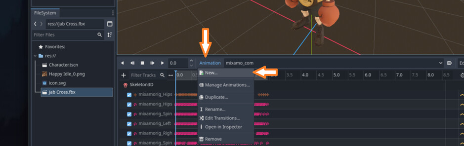 Select your existing AnimationPlayer – Choose animation – New