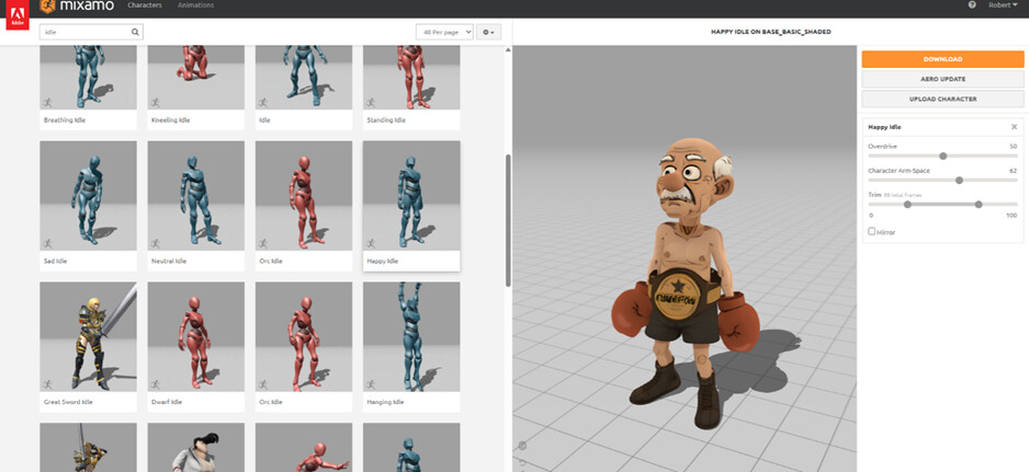 Search for “Idle” and pick Happy Idle. Adjust the arm spacing so your poor character doesn’t look like they’re constantly trying to hug an invisible refrigerator.