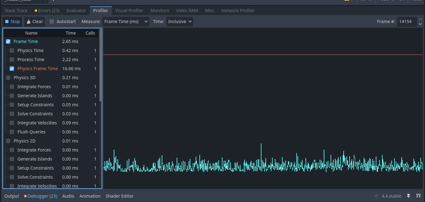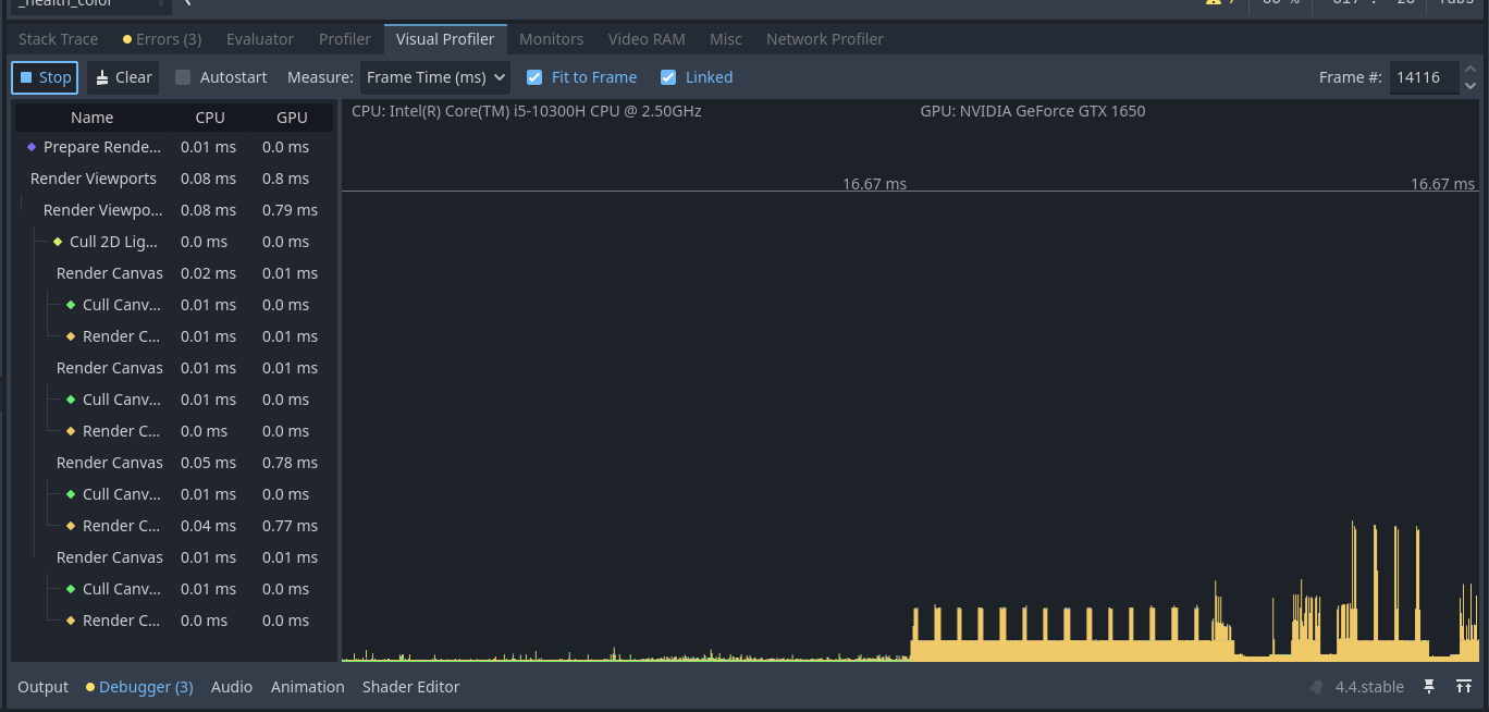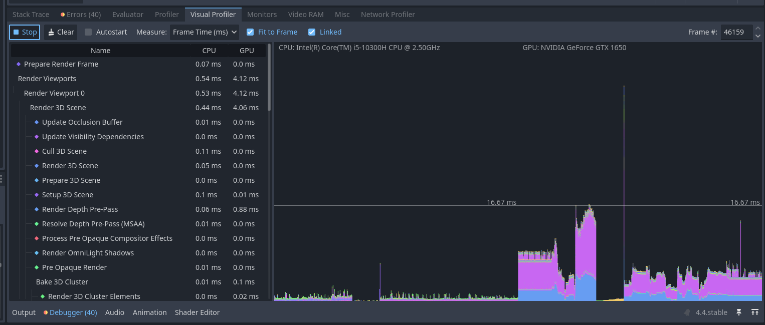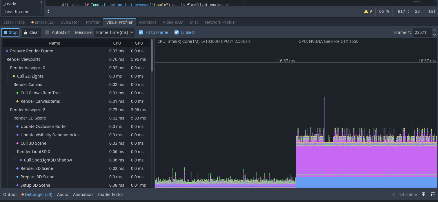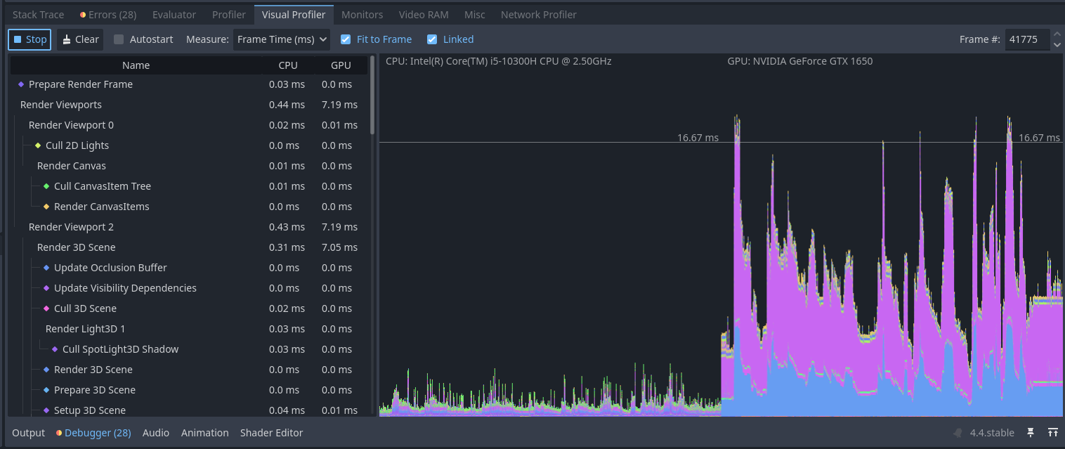 This is on your fast machine? Only some spikes below 60fps. The huge spike in the last (visual profiler) shot is expected, as it seems that’s the moment where the new scene is loaded.
