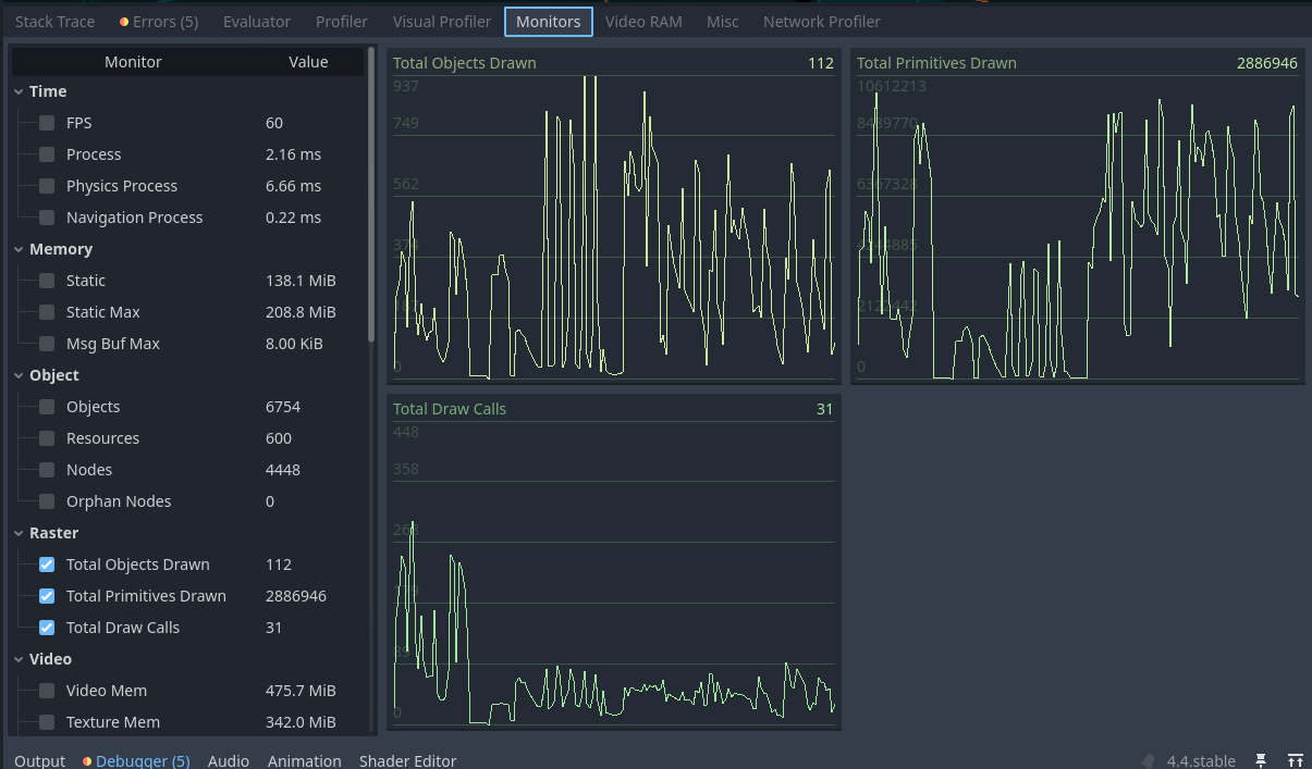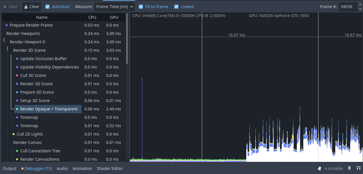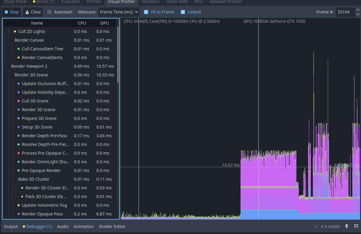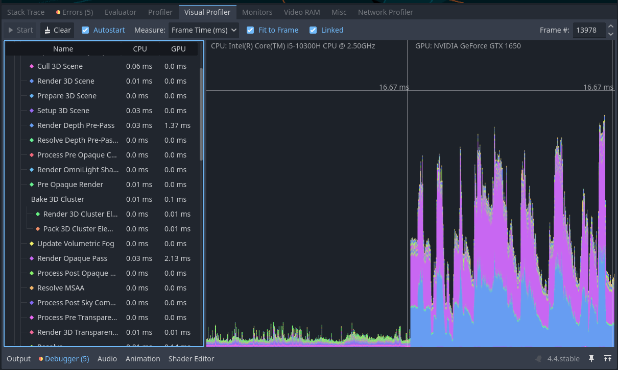 Also I mentioned that I have these insane spikes when I have my game launched and then visit the godot editor just to see how it performs, when I look at the charts, the spikes start to appear as soon as I open the visualizer. When I play the game these spikes don’t seem to occur very often