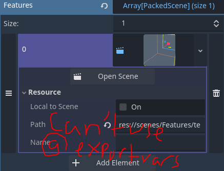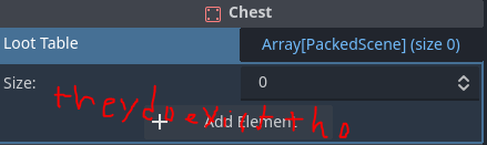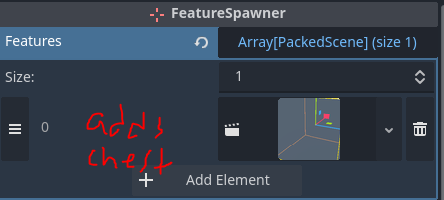 I want the chests to be randomized so I have a “feature spawner” that passes in a packed scene and will add it as a sibling then queue_free() itself.