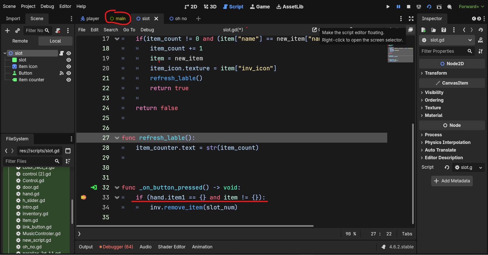 hand is node in “main” scene ,, item1 is node in type Dectinary