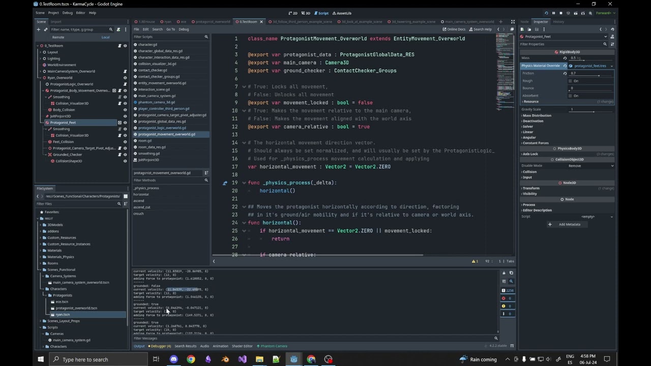 It uses phantomcamera for the camera, which can get pretty jittery, but it’s a quick way to make the character halt on landing issue much more visible. The debug logs also help a lot in seeing that the velocity reaches nearly 0 on all axis, on landing.