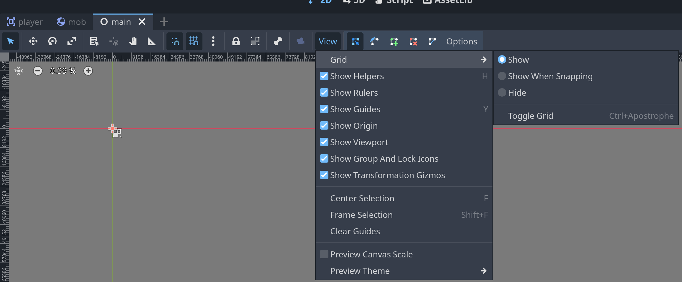 In the section “Spawning Mobs” the grid lines of the screen are not present in the editor to add the points. The toggle doesn’t turn it on. It only appears in the Player node. Not the Mob node or Main node and its children. Did I mess something up?