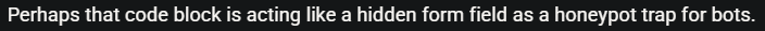 Perhaps that code block is acting like a hidden form field as a honeypot trap for bots. If its in there it could be a bot!
