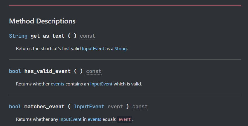 I don’t understand the shortcut stuff. I for other things I’ve just used the input map in the project settings and checked for those key presses with the strings I had assigned. However, this doesn’t seem to work with this syntax since it seems to need some Unicode value. For single press keyboard inputs I can replicate this by simply providing the character string for the key I want. However, I don’t know how to set this to take mouse inputs or shift key inputs.