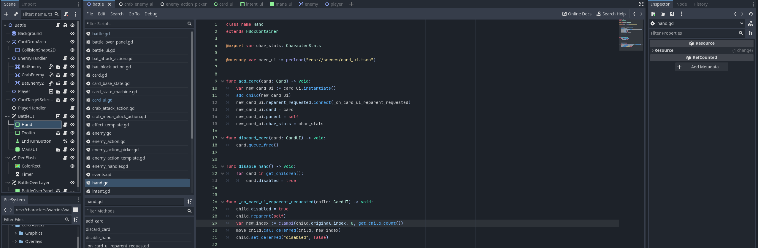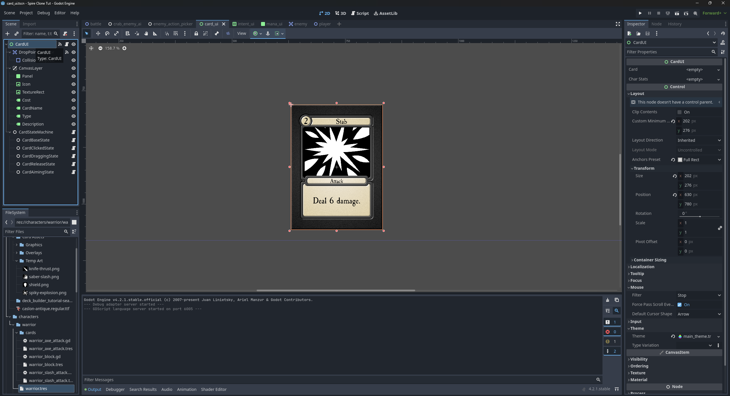 The issue comes when the cards are instantiated in the Hand ui element on the battle scene, which is an HBoxContainer at the bottom of the screen. This worked perfectly fine for the simple cards previously, but I had an issue straight away where everything was scaled really strangely, which I fixed by putting the card’s visual nodes into a CanvasLayer in the CardUI scene. However, once I’d this the issue turned into one where it seems to stack all the cards on top of each other on the left side of the hand rather than side by side, and puts the collision boxes for them in the middle of the hand. I’m not entirely sure how to approach this as I’m not sure exactly what about what I’ve done caused this issue.